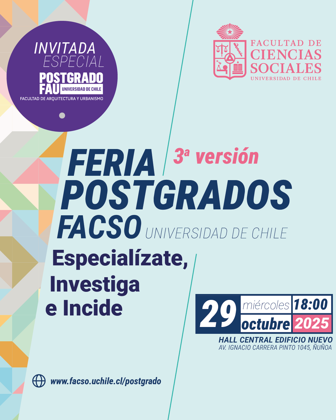 (Avenida Ignacio Carrera Pinto 1045, Ñuñoa.)Se viene la 3° Feria Postgrados FACSO UCHILE “Especialízate, Investiga e Incide", el miércoles 29 de octubre 2025 a las 18:00 horas en el Hall Central (Av. Capitán Ignacio Carrera Pinto 1045, Ñuñoa).