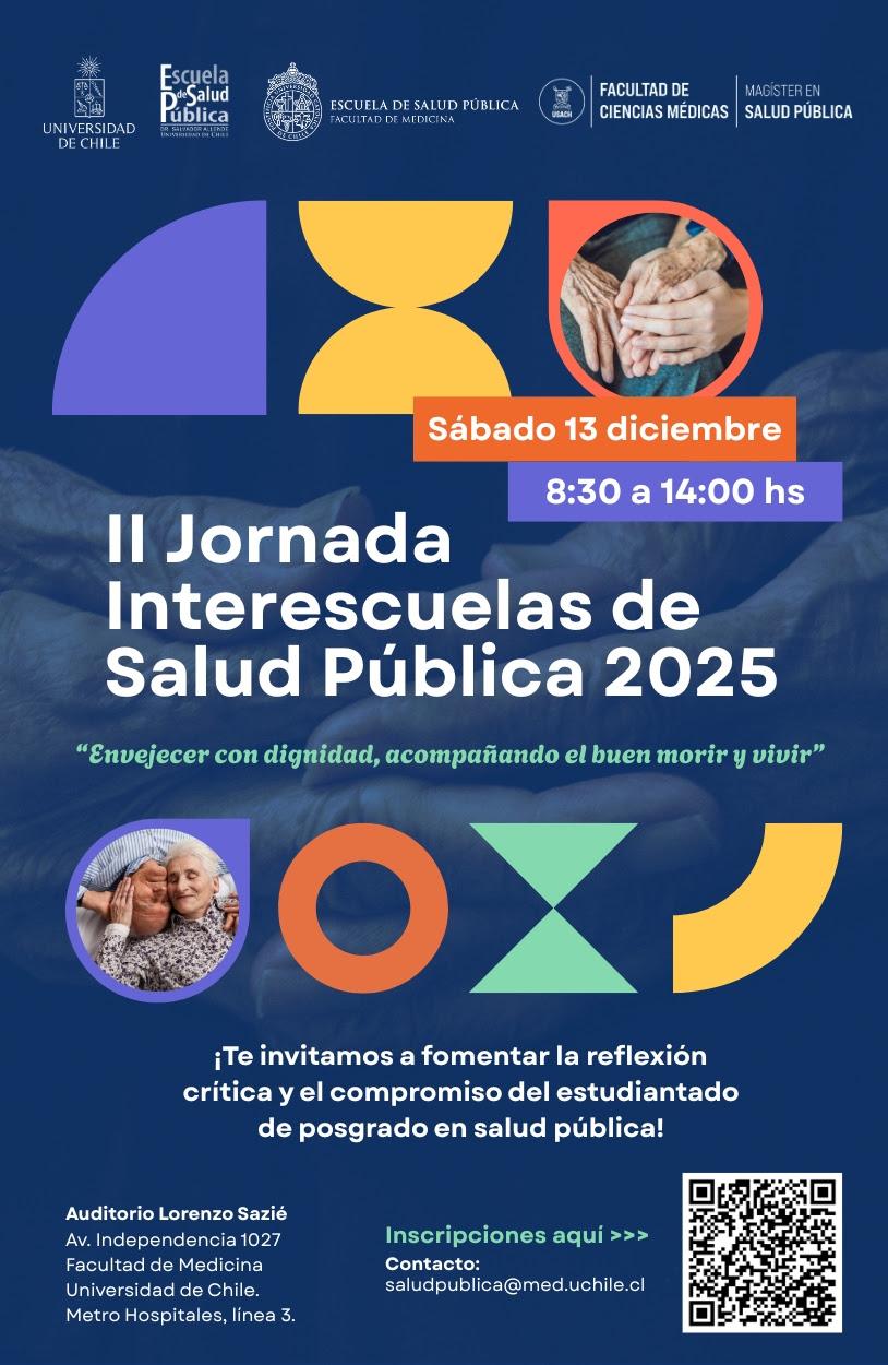 El sábado 13 de diciembre, desde las 08:30 hasta las 14:00 horas, se llevará a cabo la II Jornada Interescuela de Salud Pública 2025 bajo el título “Envejecer con dignidad, acompañando el buen vivir y morir”, en la Facultad de Medicina de la Universidad de Chile