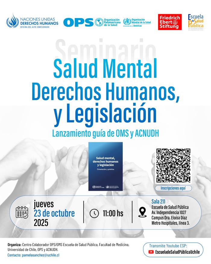 (Independencia 1027, Facultad de Medicina, Campus Dra Eloísa Díaz.)El jueves 23 de octubre de 2025, a las 11:00 horas, se realizará la actividad “Derechos Humanos, Salud Mental y Legislación” en la Sala 211 de la Escuela de Salud Pública de la Universidad de Chile, ubicada en Independencia 1027, Facultad de Medicina, Campus Dra. Eloísa Díaz. La jornada es organizada por el Programa de Salud Mental de la Escuela de Salud Pública de la Universidad de Chile, junto a la Organización Panamericana de la Salud (OPS) y la Oficina del Alto Comisionado de las Naciones Unidas para los Derechos Humanos (ACNUDH).