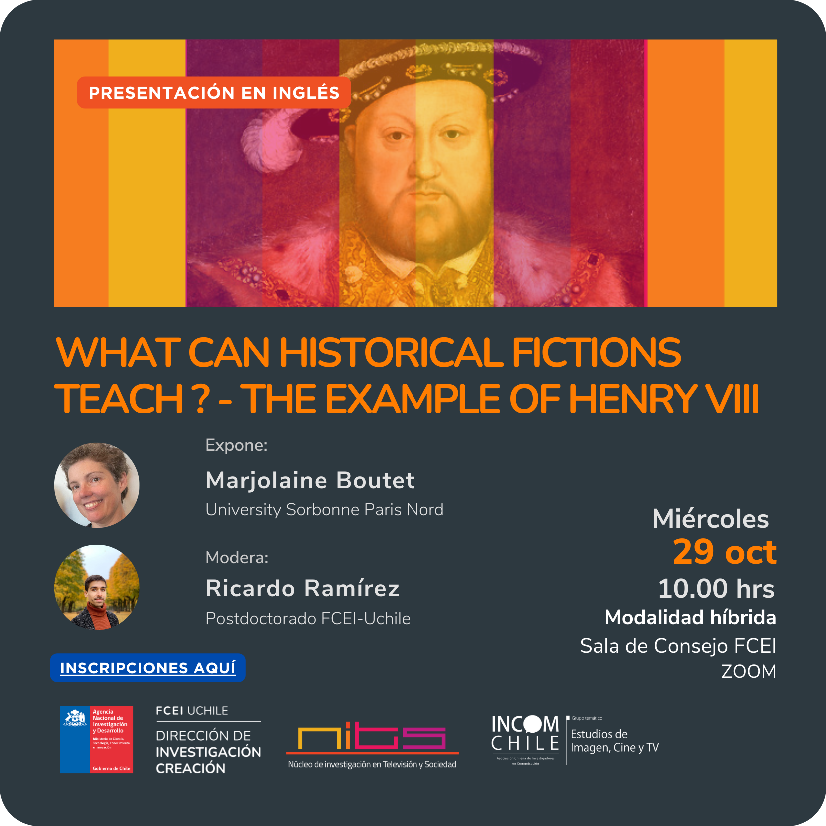 (Capitán Ignacio Carrera Pinto 1045, Ñuñoa)La Dirección de Investigación Creación, en conjunto con el Núcleo de Televisión y Sociedad, tiene el agrado de invitarles al conversatorio What can historical fictions teach? - The example of Henry VIII a realizarse el día miércoles 29 de octubre desde las 10:00 a 12:00 horas en la Sala del Consejo del FCEI (participación presencial) o por ZOOM (participación virtual).