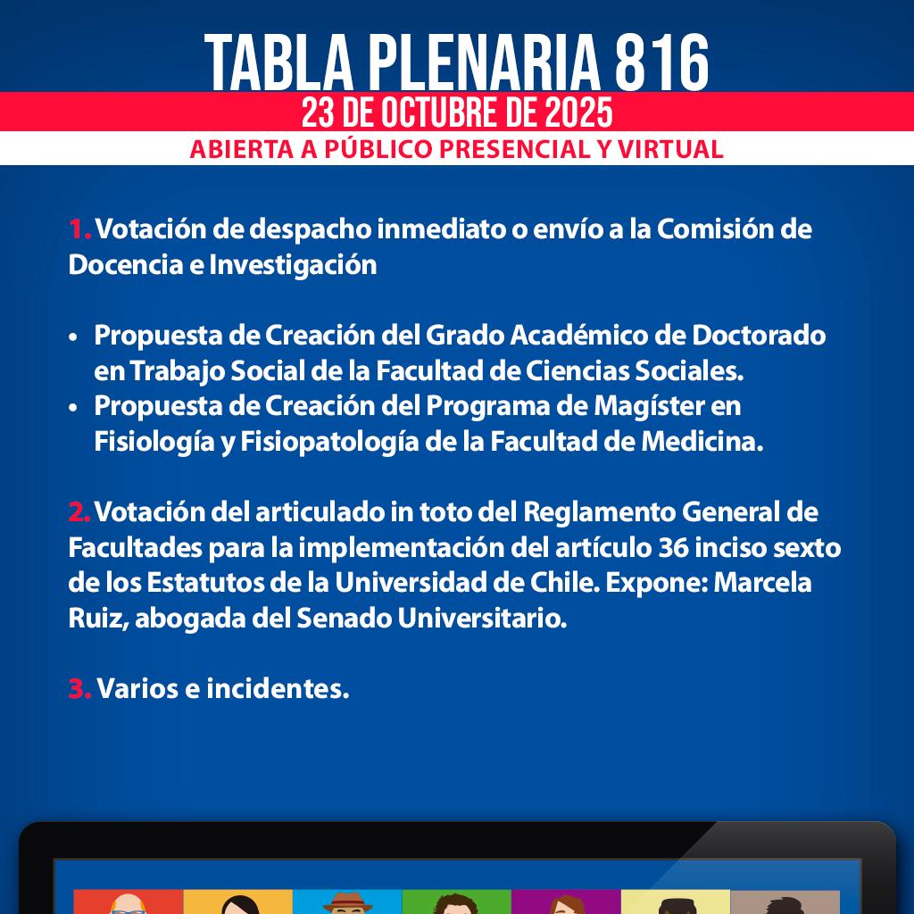 Votación del articulado in toto del Reglamento General de Elecciones y Consultas para la implementación del artículo 36 inciso sexto de los Estatutos de la Universidad de Chile. Expone: Marcela Ruiz, abogada del Senado Universitario (60 minutos).