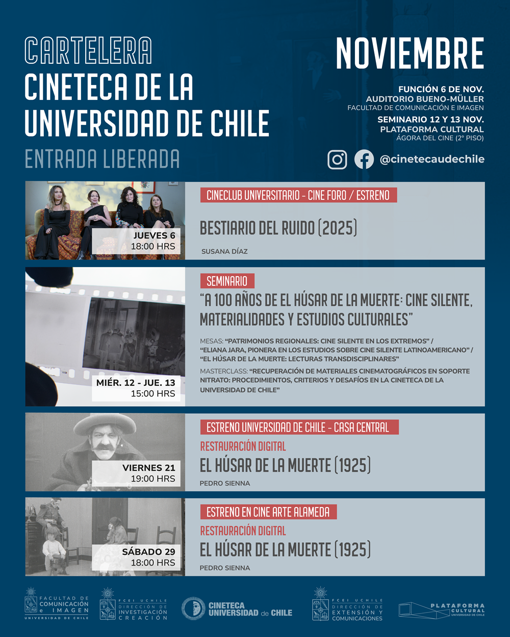 Por otra parte, la cartelera de actividades de Cineteca se compone del 3º Seminario A 100 años de El húsar de la muerte: cine silente, materialidades y estudios culturales, que se realizará en dos jornadas en la Plataforma Cultural de la Universidad de Chile.