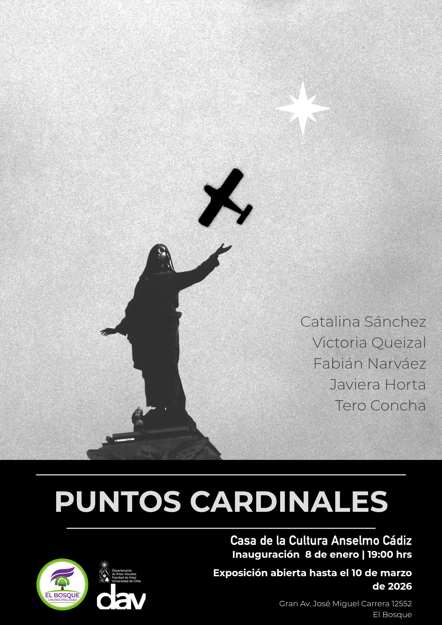 La inauguración de la muestra colectiva Puntos Cardinales se realizará el jueves 8 de enero a las 19:00 horas de 2026 en la Casa de la Cultura Anselmo Cádiz, ubicado en Gran Avenida José Miguel Carrera 12552 en la comuna de El Bosque. Estará en exhibición hasta el 10 de marzo de 2026. La entrada es liberada, sin inscripción previa.