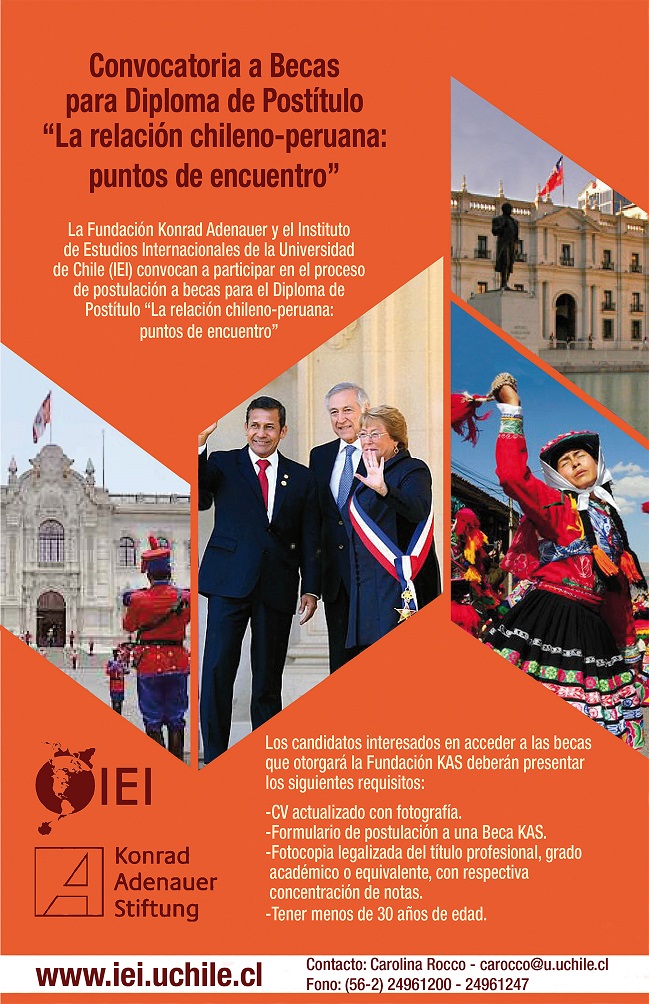 La fundación Konrad Adenauer (KAS) y el Instituto de Estudios Internacionales de la Universidad de Chile (IEI) convocan a participar en el proceso de postulación a becas para el diploma de postítulo "La relación chileno-peruana: puntos de encuentro".