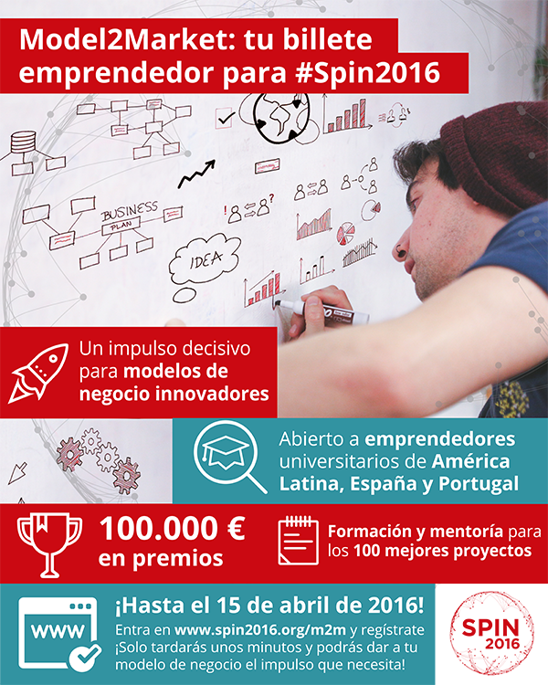 En Spin2016, los emprendedores finalistas de Model2Market tendrán la opción de recibir una formación intensiva para mejorar sus proyectos, además de conectar con emprendedores de éxito, empresarios consolidados, inversores y académicos de América Latina, España y Portugal, presentando sus modelos de negocio en la jornada de clausura del mayor evento de emprendimiento universitario de Iberoamérica.