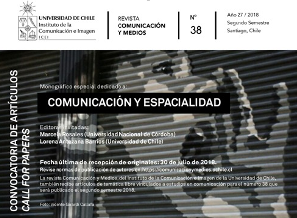La Revista Comunicación y Medios, del Instituto de Comunicación e Imagen de la Universidad de Chile, recibe artículos de temática libre vinculados a estudios en comunicación para el número 38 que será publicado durante el segundo semestre de 2018. El tema específico del número es "Comunicación y espacialidad" y cuenta con la colaboración de las editoras invitadas: Lorena Antezana Barrios (ICEI Universidad de Chile) y Marcela Rosales (xx).