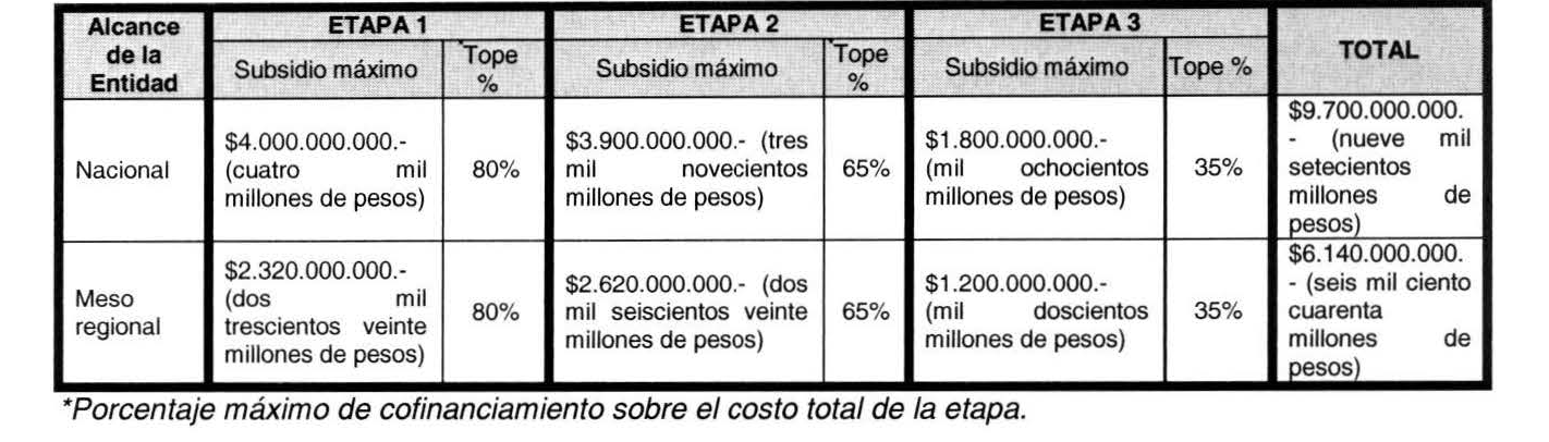 - Hasta 9.700 millones de pesos, con cargo al subsidio, distribuidos en 3 Etapas: 1ra Etapa de hasta 4.000 millones de pesos para 3 años, 2da Etapa de hasta 3.900 millones de pesos, para 4 años y 3ra Etapa de hasta 1.800 millones de pesos, para 3 años.