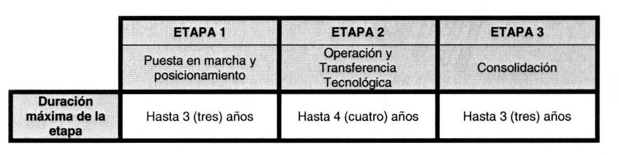 El plazo de duración de los proyectos deberá ser de hasta 120 meses. La ejecución de los proyectos se dividirá en 3 Etapas en función de lo indicado en la siguiente tabla:
