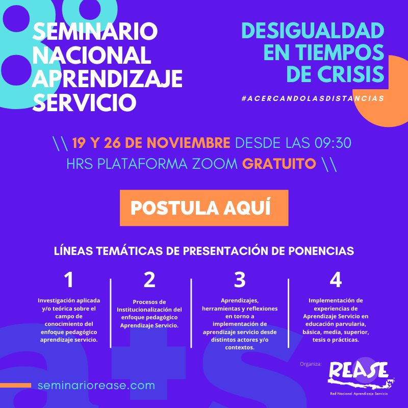 La Red Nacional de Aprendizaje y Servicio invita a participar en el 8vo Seminario Nacional de Aprendizaje Servicio, que se realizará entre los días 19 al 26 de noviembre. Este año convoca el tema "Desigualdad en Tiempos de Crisis - Acercando las distancias", y la postulación a ponencias es hasta el día 18 de octubre. Para mayor información, visite: http://www.seminariorease.com/.