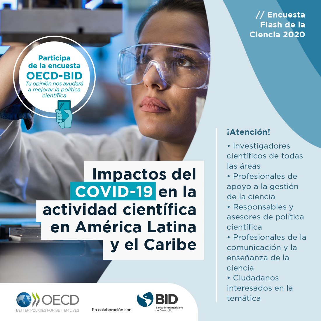 La “Encuesta Flash de la Ciencia 2020” es una iniciativa impulsada por la OECD en colaboración con el Banco Interamericano de Desarrollo (BID). Se trata de una consulta global que busca recoger opiniones sobre los impactos de la emergencia sanitaria en la actividad científica y sus implicancias para el futuro.