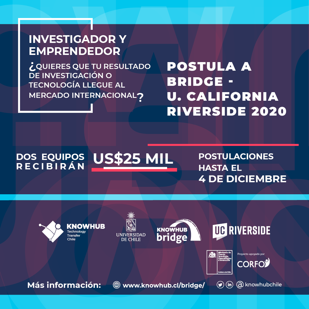 Esta versión del programa cuenta con un aliado internacional estratégico de Know Hub Chile: la Universidad de California Riverside (UC Riverside, Estados Unidos). Específicamente, con su programa Proof-of-Concept, que cuenta con el auspicio de la empresa española Eurosemillas S.A., que posee contratos de licenciamiento de numerosas variedades vegetales con la universidad estadounidense. De esta sinergia, surge la convocatoria Bridge – UC Riverside 2020.