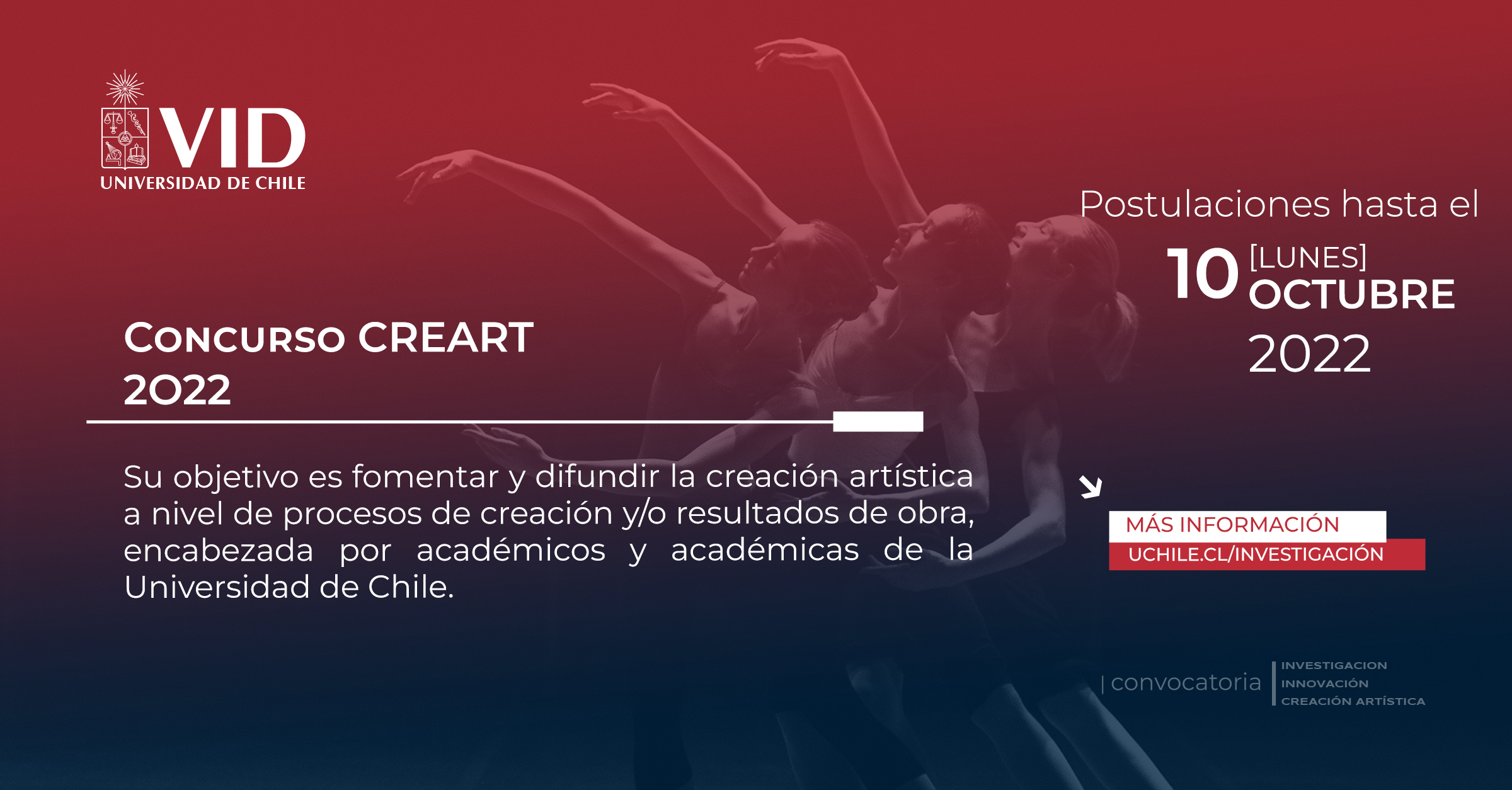 Fomentar la producción y circulación de la creación artística a nivel de procesos de creación y/o resultados de obra, encabezada por académicos y académicas de la Universidad de Chile, junto a otros actores involucrados como estudiantes, instituciones académicas aliadas y sociedad civil, en consonancia con la política de la VID por apoyar la productividad en todas las disciplinas que se cultivan en nuestra casa de estudios, incluyendo la creación artística como una actividad fundamental para el desarrollo de nuestra misión institucional de los/as académicos/as de la Universidad de Chile.