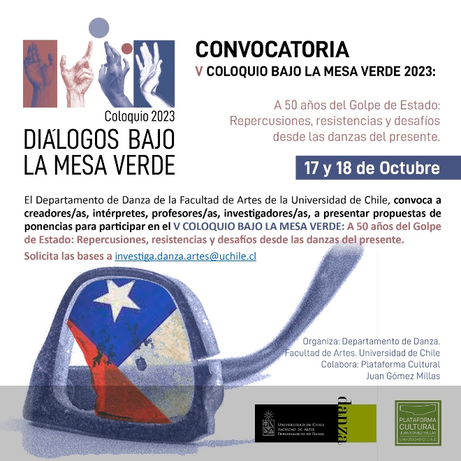 El Departamento de Danza de la Facultad de Artes de la Universidad de Chile, a través de sus áreas de Investigación, Creación, Patrimonio, Extensión y Producción convoca a creadores/as, intérpretes, profesores/as, investigadores/as, a presentar propuestas de ponencias para participar en el V COLOQUIO BAJO LA MESA VERDE: A 50 años del Golpe de Estado: Repercusiones, resistencias y desafíos desde las danzas del presente.