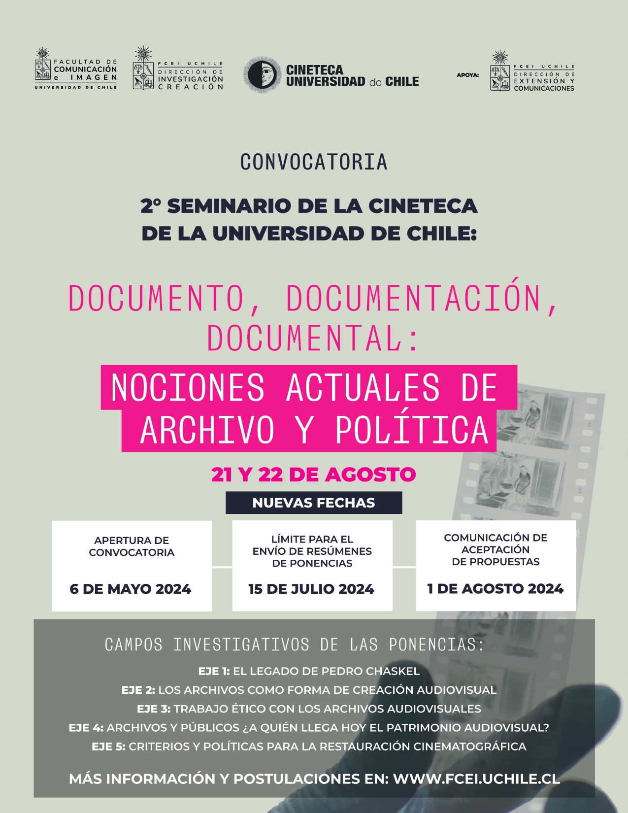 Es en este contexto que la Cineteca de la Universidad de Chile convoca a investigadores/as, docentes, críticos/as, archivistas y estudiantes a participar en su II Seminario, bajo el tema Documento, documentación, documental: nociones actuales de archivo y política, que se realizará los días 21 y 22 de agosto de 2024. La presentación de resúmenes debe corresponder a textos originales, no publicados anteriormente en ponencias o artículos académicos, y orientados en alguno de los 5 ejes programáticos, los cuales buscan profundizar en campos de discusión que, para la disciplina, resultan fundamentales en cuanto fortalecer el debate sobre el rol social que cumplen los archivos y el patrimonio audiovisual en la cultura, a partir de discusiones contemporáneas sobre visualidad y política.