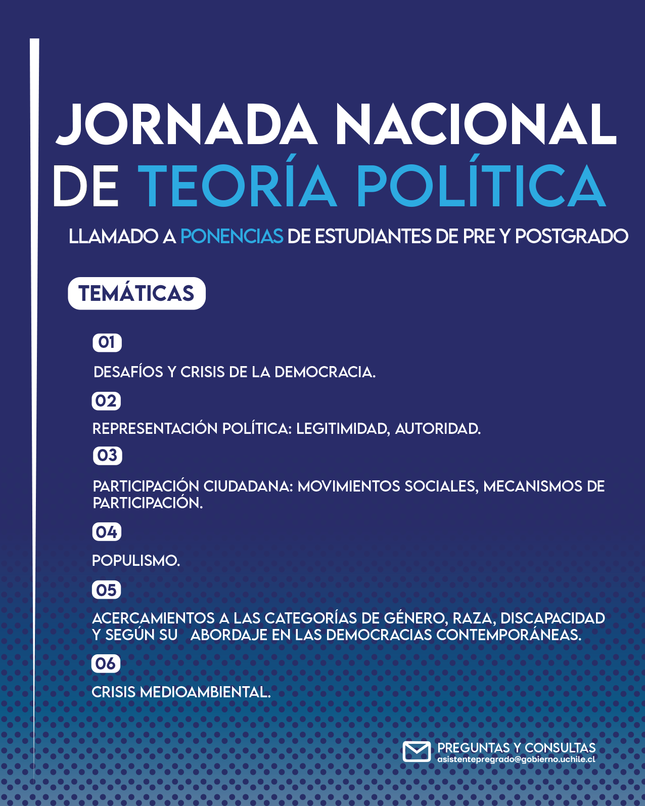 La Teoría Política es una subdisciplina que se pregunta por conceptos propios de lo político, y sobre el modo en que estos han conformado las instituciones políticas, estructuras y dinámicas entre actores que conocemos hoy. Por ejemplo, la justicia, la legitimidad, la libertad, el bien común y la soberanía. La Jornada Nacional de Teoría Política busca ser un espacio para discutir y analizar una amplia variedad de temáticas propias de esta subdisciplina. Esta se llevará a cabo los días 5 y 6 de noviembre en las instalaciones de ambas instituciones organizadoras. Escuela de Gobierno y Administración Pública de la Universidad Mayor y la Escuela de Gobierno y Gestión Pública de la Universidad de Chile. La modalidad de la jornada será presencial pero las actividades centrales se transmitirán en línea. A su vez, se puede solicitar participar con una presentación en formato remoto.
