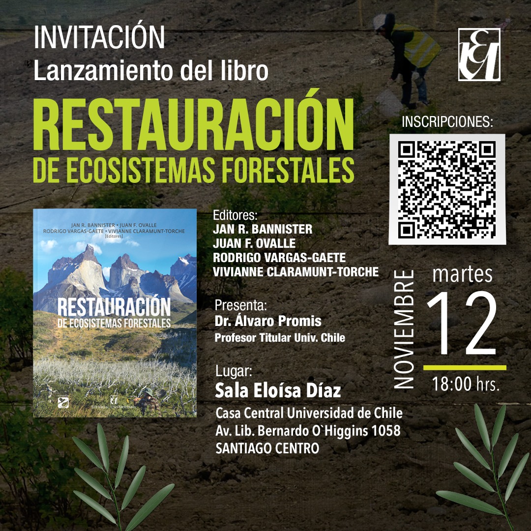 El martes 12 de noviembre, a las 18:00 horas, se presentará en la Sala Eloísa Díaz de Casa Central, la publicación que reúne valiosos aportes de especialistas nacionales e internacionales respecto de la importancia de la restauración de los ecosistemas forestales. La obra, editada por Juan F. Ovalle, Jan R. Bannister, Rodrigo Vargas-Gaete y Vivianne Claramunt-Torche; busca inspirar a nuevas generaciones para aprender y preservar la calidad de vida, tanto de los seres humanos como de los ecosistemas naturales del planeta. Más información, aquí.