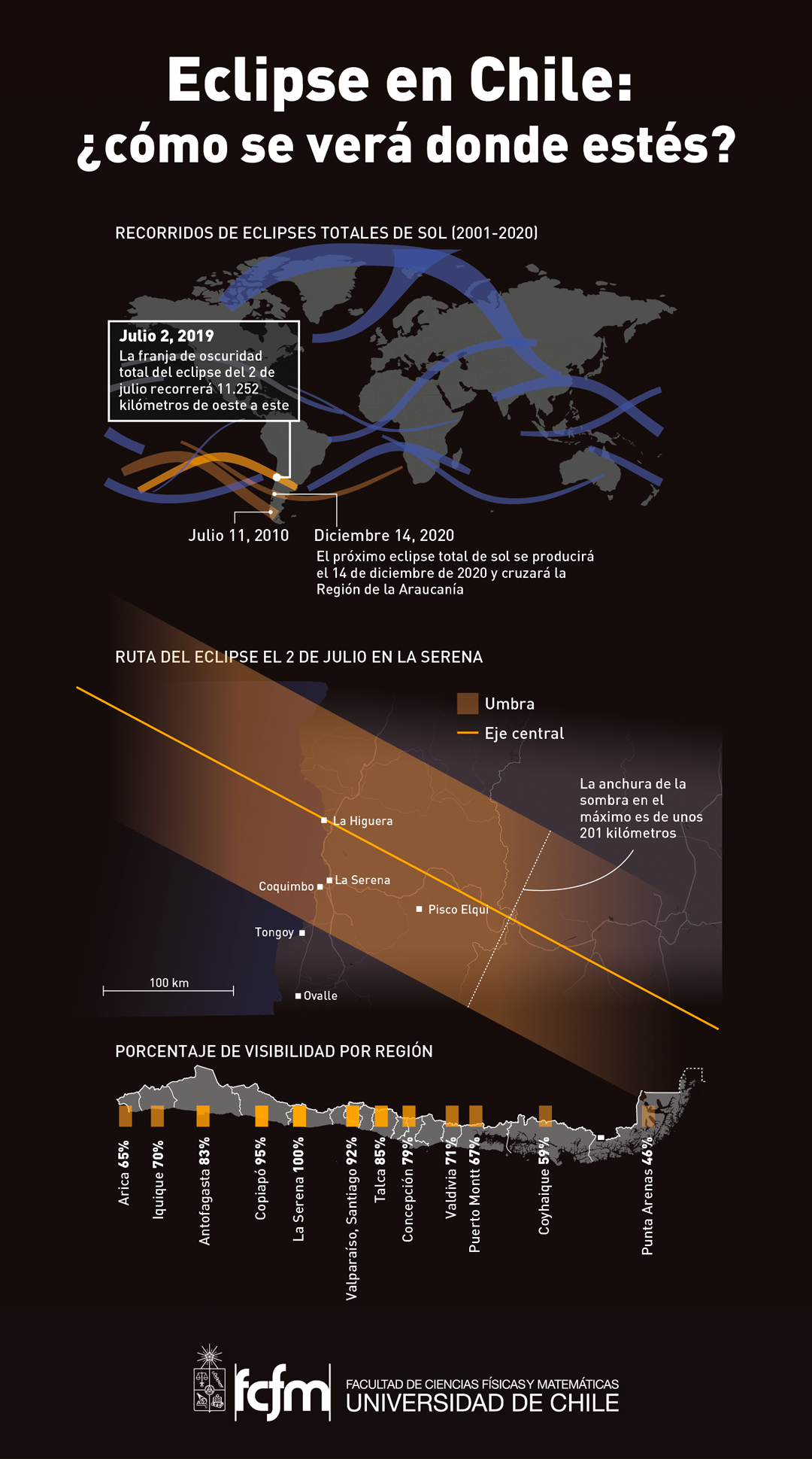 Visualización de datos claves de los eclipses totales de sol que se podrán observar directamente en territorio nacional este 2 de julio de 2019 y 14 de diciembre de 2020.
