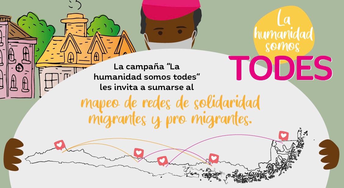 La campaña "La humanidad somos todes" les invita a sumarse al mapeo de redes de solidaridad migrante y pro migrante. La información entregada en este formulario hará parte de un producto gráfico que permitirá conocer y contactar a las distintas redes que se despliegan a nivel nacional y local sin distinciones ni discriminaciones. Esperamos que este mapeo pueda promover las iniciativas de apoyo que ya se están dando en todo los territorios, pues hoy más que nunca se hace presente que "el pueblo ayuda al pueblo".