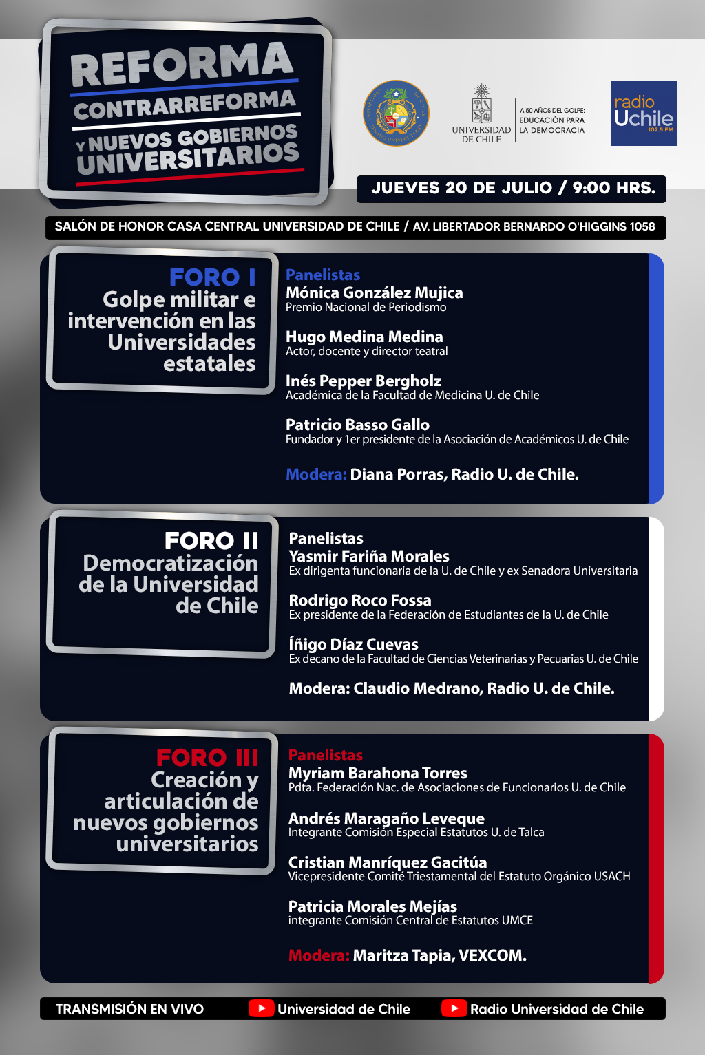El jueves 20 de julio en el Salón de Honor de la Casa Central de la Universidad de Chile, el Senado Universitario realizará la jornada de conmemoración de los 50 años del golpe cívico militar “Reforma, Contrarreforma y Nuevos Gobiernos Universitarios”, un espacio de encuentro y diálogo sobre los efectos de la dictadura militar en la Universidad, su comunidad y el sistema de educación superior chileno.
