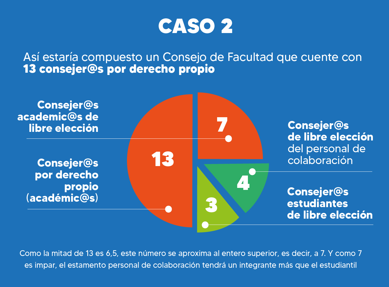 Además, mantuvo la norma que estipula que si la cantidad total de consejeros/as de libre elección no corresponde a un número entero, el número total de consejeros/as de libre elección será el entero inmediatamente superior. Todo esto se aplicaría de la siguiente manera: