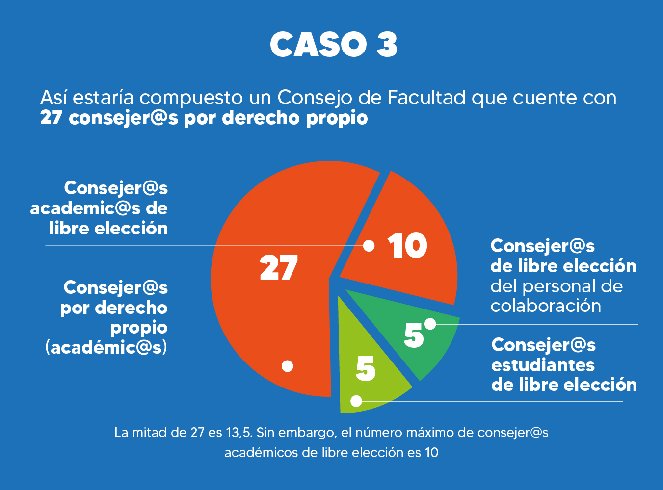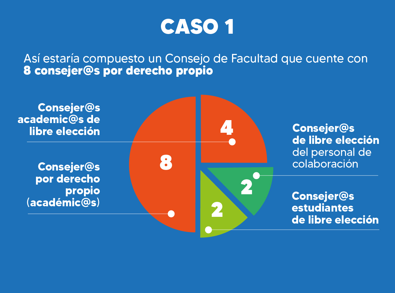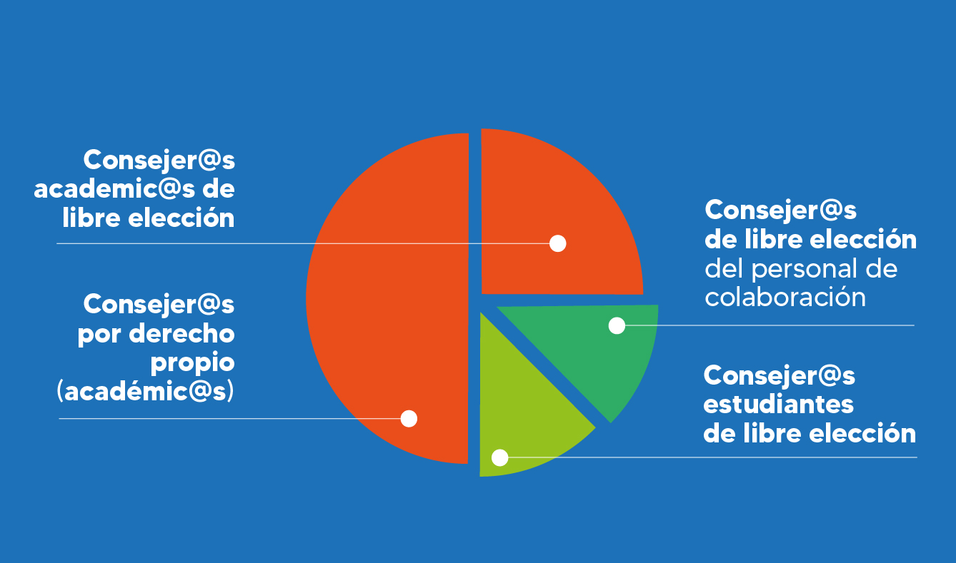 Al respecto, se acordó que la mitad de los/as integrantes de los Consejos de Facultad serán consejeros/as académicos/as por derecho propio, y la otra mitad consejeros/as de libre elección, quienes, a su vez, se compondrán en un 50% por académicos/as, un 25% por estudiantes, y un 25% por representantes del personal de colaboración.