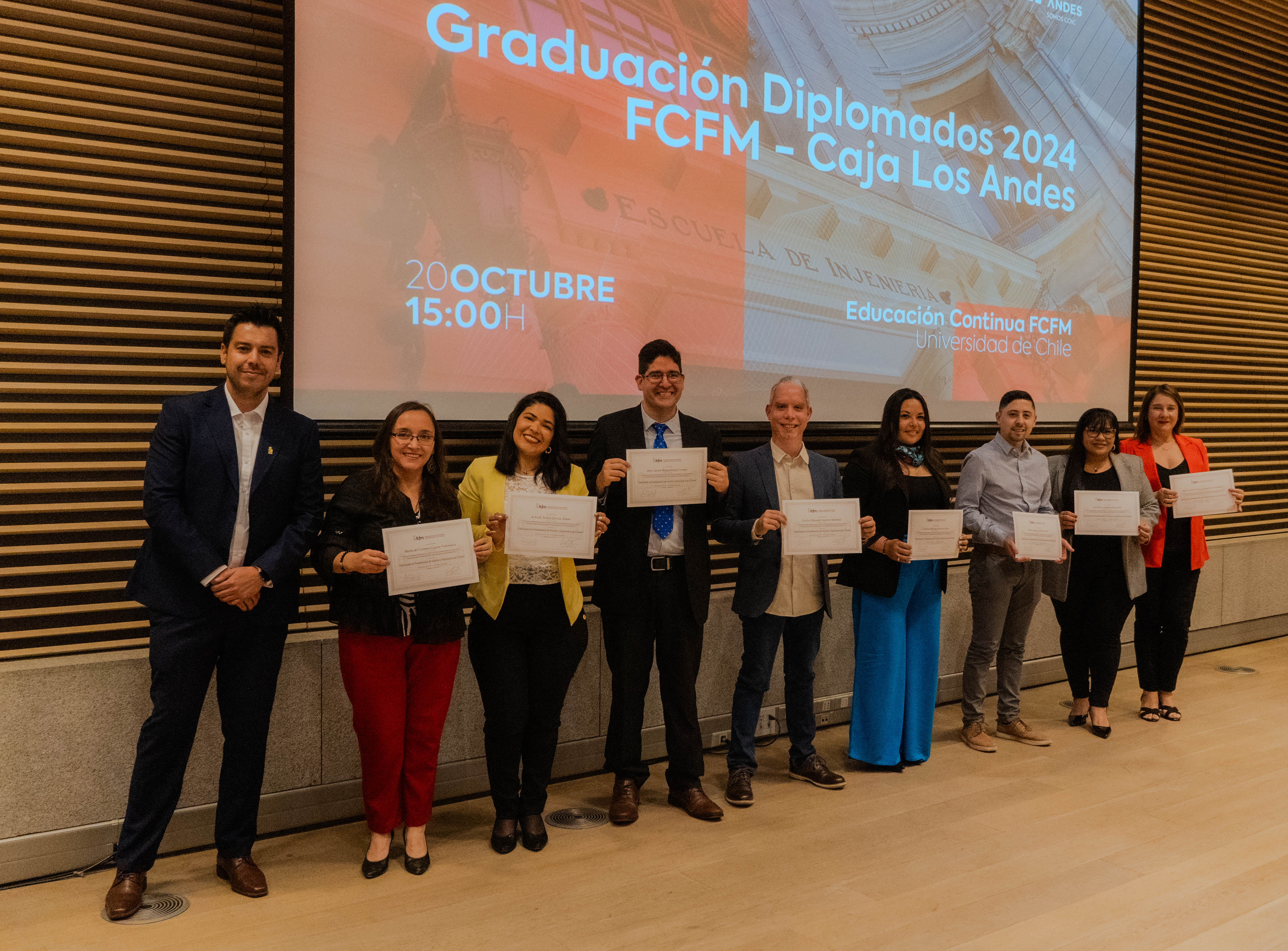 La Facultad de Ciencias Físicas y Matemáticas (FCFM) de la Universidad de Chile celebró el pasado 20 de octubre la ceremonia de graduación de 98 colaboradores y colaboradoras de Caja Los Andes, 61 de la Región Metropolitana y 27 de diferentes regiones, quienes completaron exitosamente diversos Diplomados online de la Escuela de Postgrado y Educación Continua.