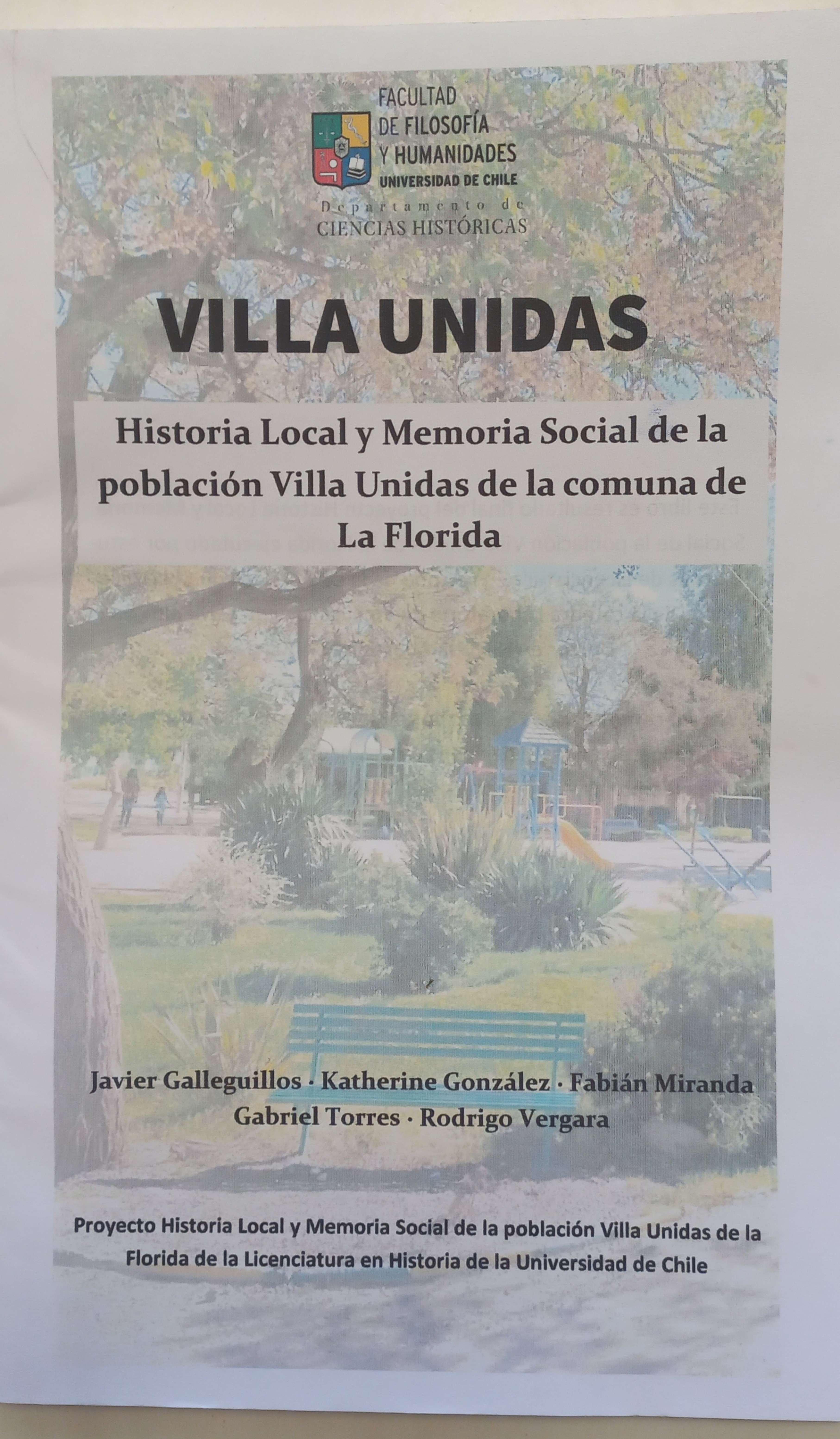 El proyecto “Memoria e historia de la población Villas Unidas de La Florida”, desarrollado por los estudiantes Javier Galleguillos Rubio, Katherine González Morales, Fabián Miranda Cárdenas, Gabriel Torres Sáez y Rodrigo Vergara Sepúlveda, buscó fortalecer los lazos comunitarios y reforzar la identidad local mediante la recuperación de la memoria social e histórica de este emblemático barrio. A través de un trabajo participativo con vecinas y vecinos, los estudiantes han recopilado relatos orales, fotografías y documentos que dan cuenta de las luchas, transformaciones y tradiciones que han marcado la vida de la comunidad. El producto central de la iniciativa fue la elaboración y distribución de un Boletín Comunitario con la historia de la Villa.