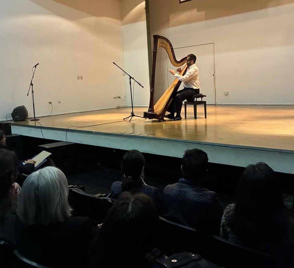 Por su parte, el arpista formado en la Facultad de Artes, Pablo Cristi, entregó al público una experiencia única de interpretación en arpa en dos piezas musicales: el primer movimiento del concierto para arpa de Georg Friedrich Händel (en una versión de Marcel Grandjany) y “La source” del compositor Alphonse Hasselmans. La presentación estuvo marcada por la delicadeza y majestuosidad del arpa en manos de un músico que dedica su práctica a un instrumento usualmente reservado para las grandes orquestas, y que en esta ocasión, fue ofrendado a la comunidad universitaria.