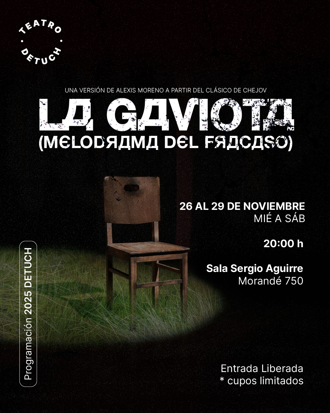 En el marco de la Temporada 2025 del Departamento de Teatro de la Facultad de Artes de la Universidad de Chile, este 27, 28 y 29 de noviembre a las 20hrs en la Sala Sergio Aguirre se presentará la obra La Gaviota (Melodrama Del Fracaso), una versión de Alexis Moreno a partir del clásico de Chejov, protagonizada por estudiantes de II año de Actuación Teatral y Diseño Teatral, con la guía de Diseño Escénico de Andrea Contreras.