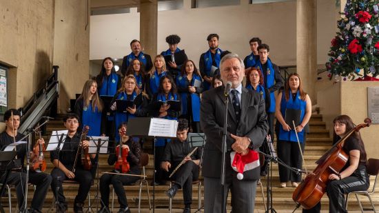 La celebración se inició con la presentación del Coro Lex, que interpretó tradicionales villancicos y aportó el toque musical que selló el ambiente navideño. Entre quienes se sumaron al canto destacó el Decano Pablo Ruiz-Tagle, quien participó entonando algunos villancicos junto al coro.