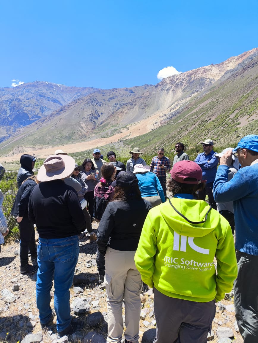 La fase presencial del curso incluyó una visita al Cajón del Maipo a cargo de la profesora Marisol Lara, del Departamento de Geología, quien además es Directora Académica del programa. La visita se desarrolló en el Río El Volcán, sector donde se han registrado diversos eventos de remoción en masa —como caídas de rocas, deslizamientos y flujos de detritos— además de inundaciones. Durante la actividad, las y los estudiantes pudieron observar evidencias de estos procesos, analizar sus impactos sobre la infraestructura y discutir en el sitio las medidas implementadas.