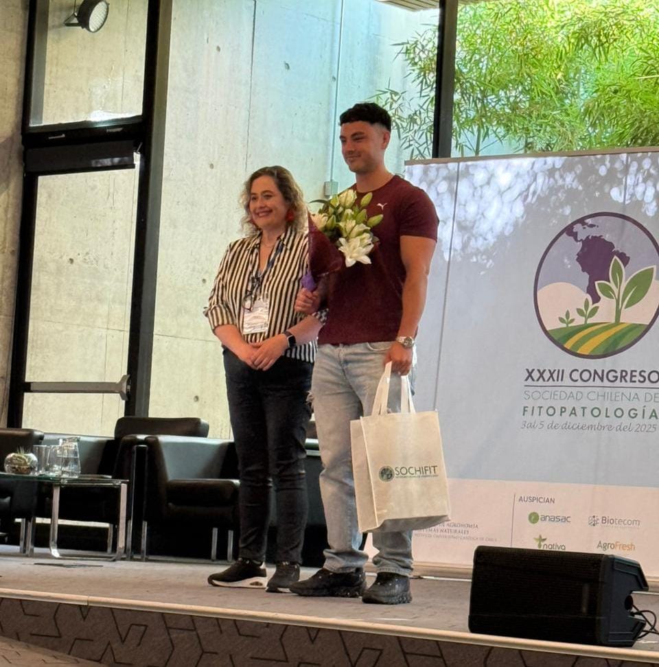 En representación del Laboratorio de Virología y Bacteriología Vegetal —dirigido por los académicos Dr. Nicola Fiore y Dr. Alán Zamorano— participaron el ingeniero agrónomo y magíster en Ciencias Agropecuarias Sebastián Cabrera, junto a los estudiantes del Magíster en Ciencias Agropecuarias Javiera Morales y Lucas Díaz, quienes obtuvieron relevantes distinciones por la calidad de sus trabajos.
