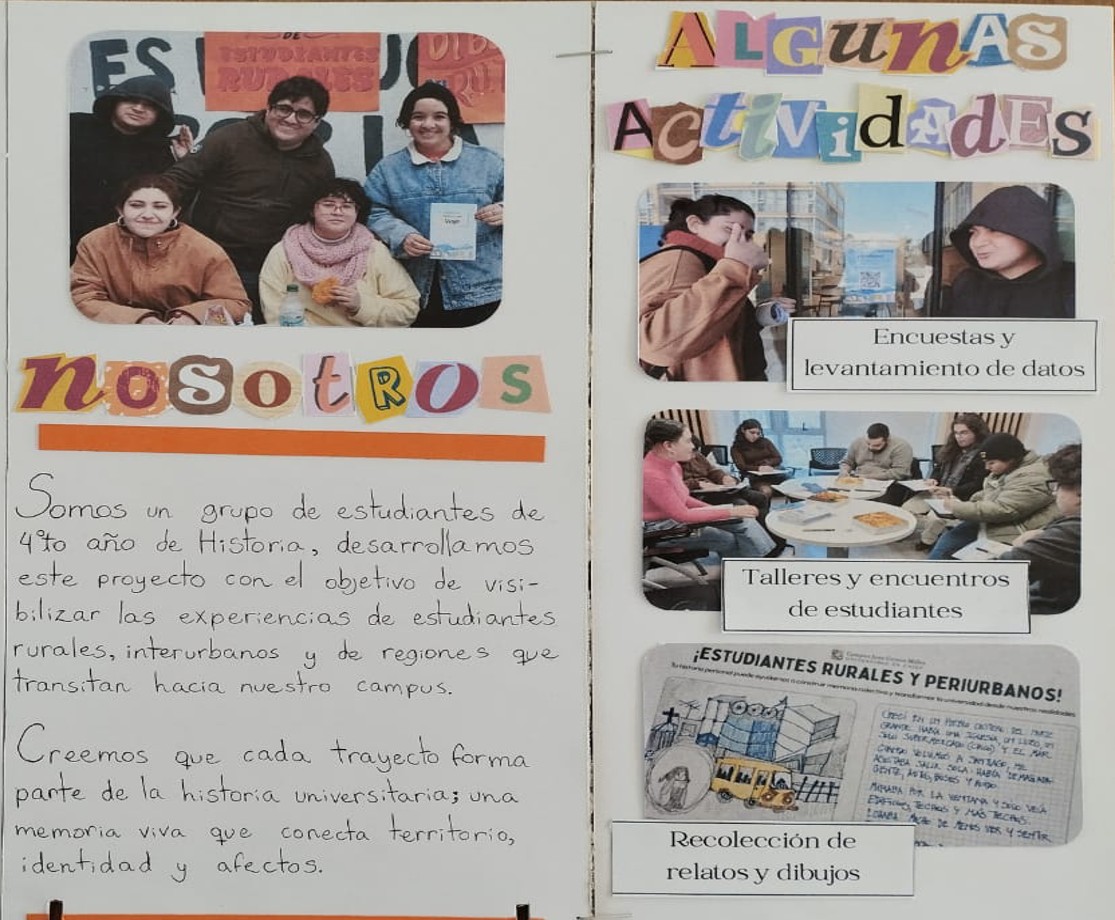 Otro de los trabajos corresponde al proyecto “Visibilización de relatos de estudiantes rurales JGM”, destinado a identificar y difundir las experiencias de estudiantes provenientes de contextos rurales y periurbanos que estudian en el Campus Juan Gómez Millas. El proyecto buscó visibilizar sus trayectorias, desafíos y estrategias de adaptación dentro del espacio universitario, contribuyendo a reconocer estas realidades dentro de la comunidad académica, para lo cual contaron con el apoyo del CREAU y Autistas Autoconvocados. El proyecto realizó conversatorios, habilitó redes sociales y editó un fanzine con relatos escritos por estudiantes y profesores que viven y vivieron la experiencia del traslado desde regiones y áreas rurales de la RM, el que fue entregado a los escritores y dejado en la biblioteca de la Facultad. La iniciativa fue realizada por Angélica Velásquez, Bernardo Villalón, Constanza Carrasco, Francisca Gutiérrez y Marcelo Méndez.