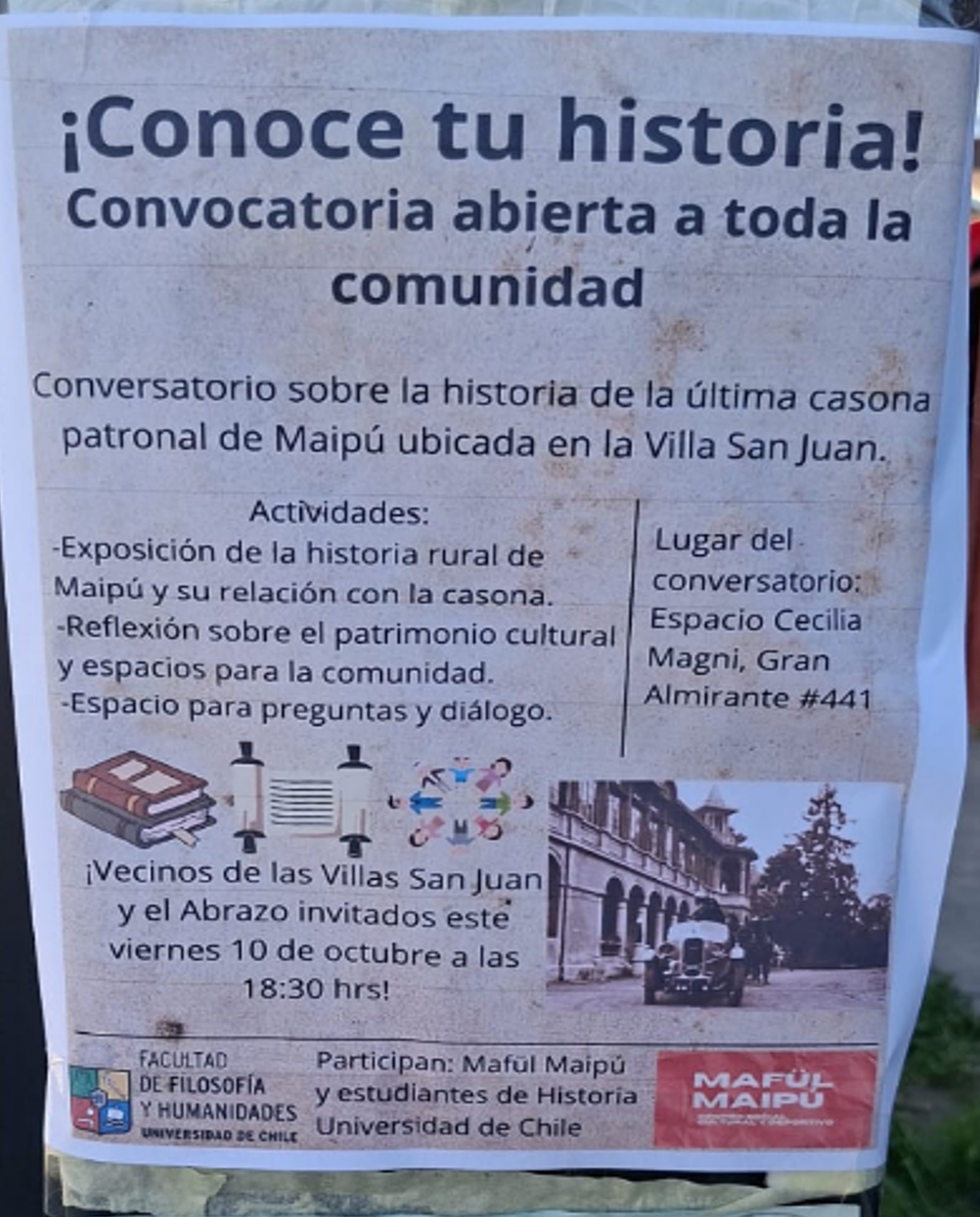 En el ámbito del patrimonio local, el proyecto “Revalorización y memoria del patrimonio local: Casona Valdés, comuna de Maipú” se centró en destacar la importancia de este sitio patrimonial, promoviendo la conciencia histórica y la participación comunitaria de los vecinos en su preservación y difusión. Entre las acciones desarrolladas se cuentan un conversatorio de historia de la casona, una visita guiada a la casona, una intervención en terreno de la casona, así como diversas acciones de difusión en redes sociales. Este trabajo fue desarrollado por Agustín Mansilla, Bianco Páez, Giancarlo Mera y Vicente Fernández.
