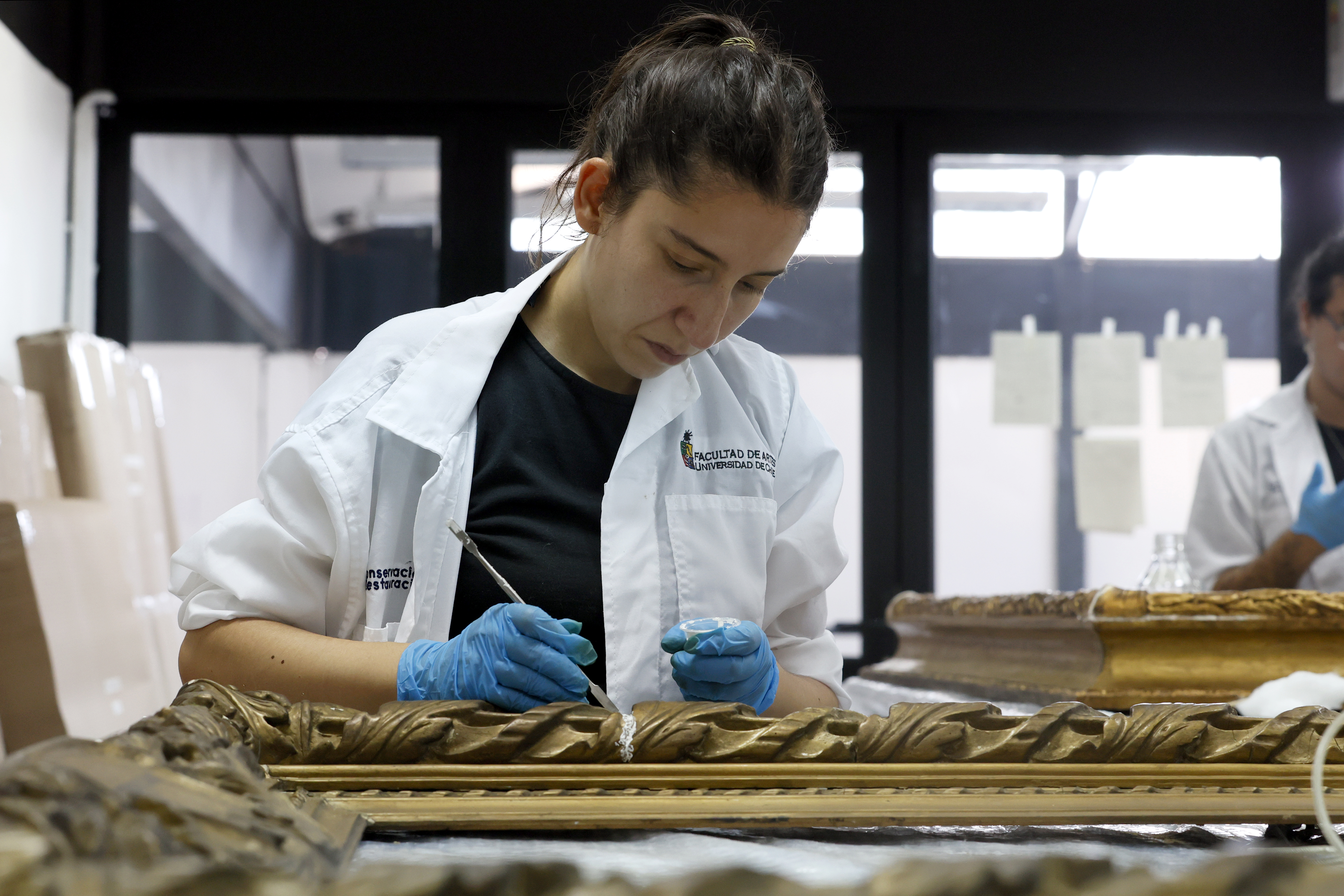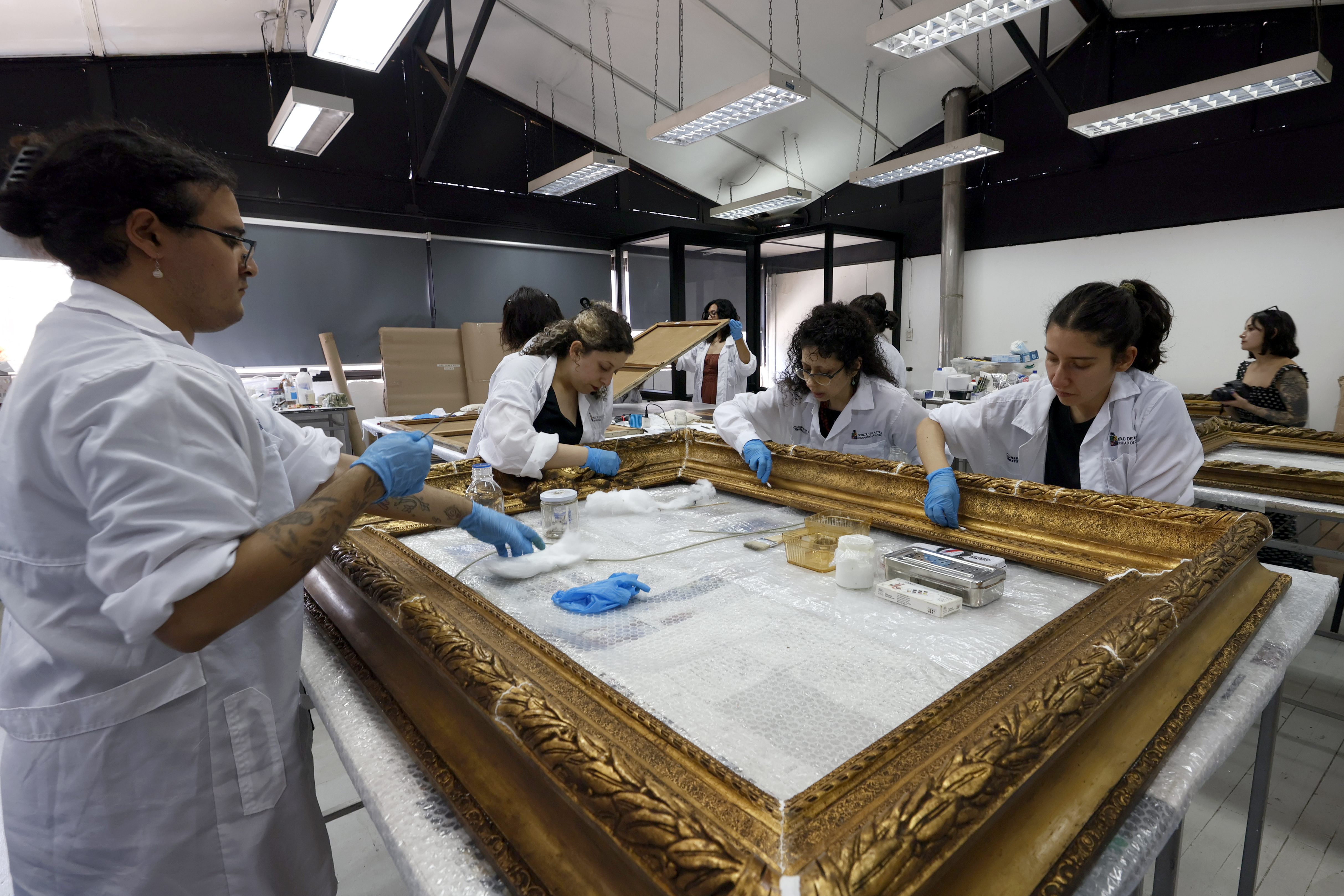 Carolina Muñoz, magíster en Conservación y Restauración de Objetos Patrimoniales y coordinadora del equipo de restauración de la Facultad, describe: “Las intervenciones incluyen, según el estado de conservación de cada obra, consolidación de la capa pictórica, remoción de barnices envejecidos, corrección de deformaciones y unión de desgarros en los soportes. Paralelamente, los marcos están siendo trabajados mediante procesos de limpieza, consolidación, reintegraciones volumétricas y elaboración de moldes de yesería y policromía para recuperar su estabilidad y lectura estética”.