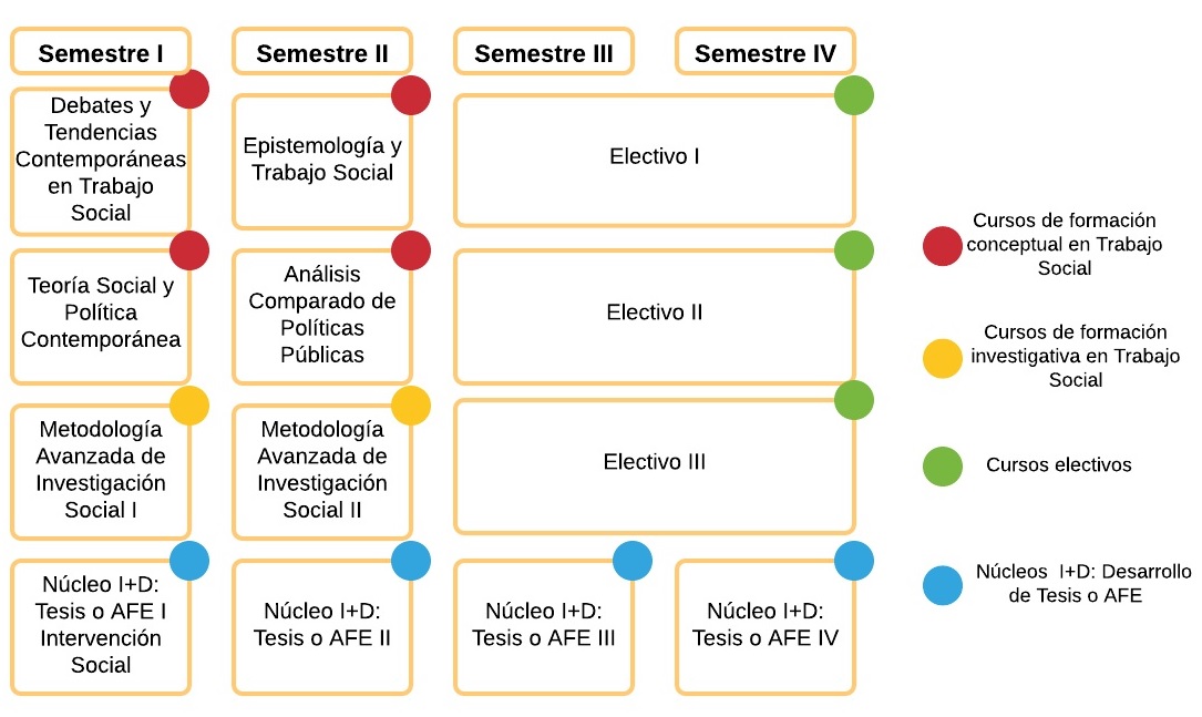 El programa de Magíster en Trabajo Social está organizado en un régimen de estudios semestral, con sistema de curriculum estructurado. Las actividades curriculares del Programa están expresadas en créditos y el Programa tiene un total de 90 créditos. Correspondiendo 1 crédito (SCT) a 27 horas cronológicas, incluyendo horas directas e indirectas que debe desarrollar el estudiante.