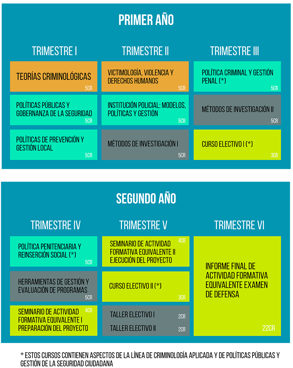 El Magíster en Criminología y Gestión de la Seguridad Ciudadana (MCGSC) tiene duración de dos años. La Malla curricular se organiza de forma trimestral. Son 6 trimestres: 3 trimestres de abril a diciembre de cada año.
