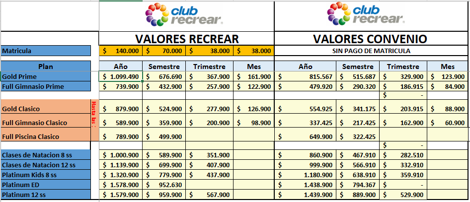 • Planes gold prime, full gimnasio prime, gold clásico, full gimnasio clásico, clases de natación, platinium kids 8ss, platinium ED, platinium 12 ss. Impartidos en los tres Clubes.