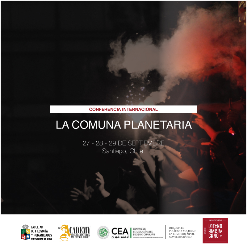 (Avda. Grecia 3401, Ñuñoa)La Facultad de Filosofía y Humanidades de la Universidad de Chile y The Academy of Global Humanities and Critical Theory, en conjunto con el Diploma en Política y Sociedad en el Mundo Árabe Contemporáneo y el Diploma en Pensamiento Crítico Contemporáneo invitan a la Conferencia internacional "La Comuna Planetaria", evento que se realizará los días 27, 28 y 29 de septiembre.