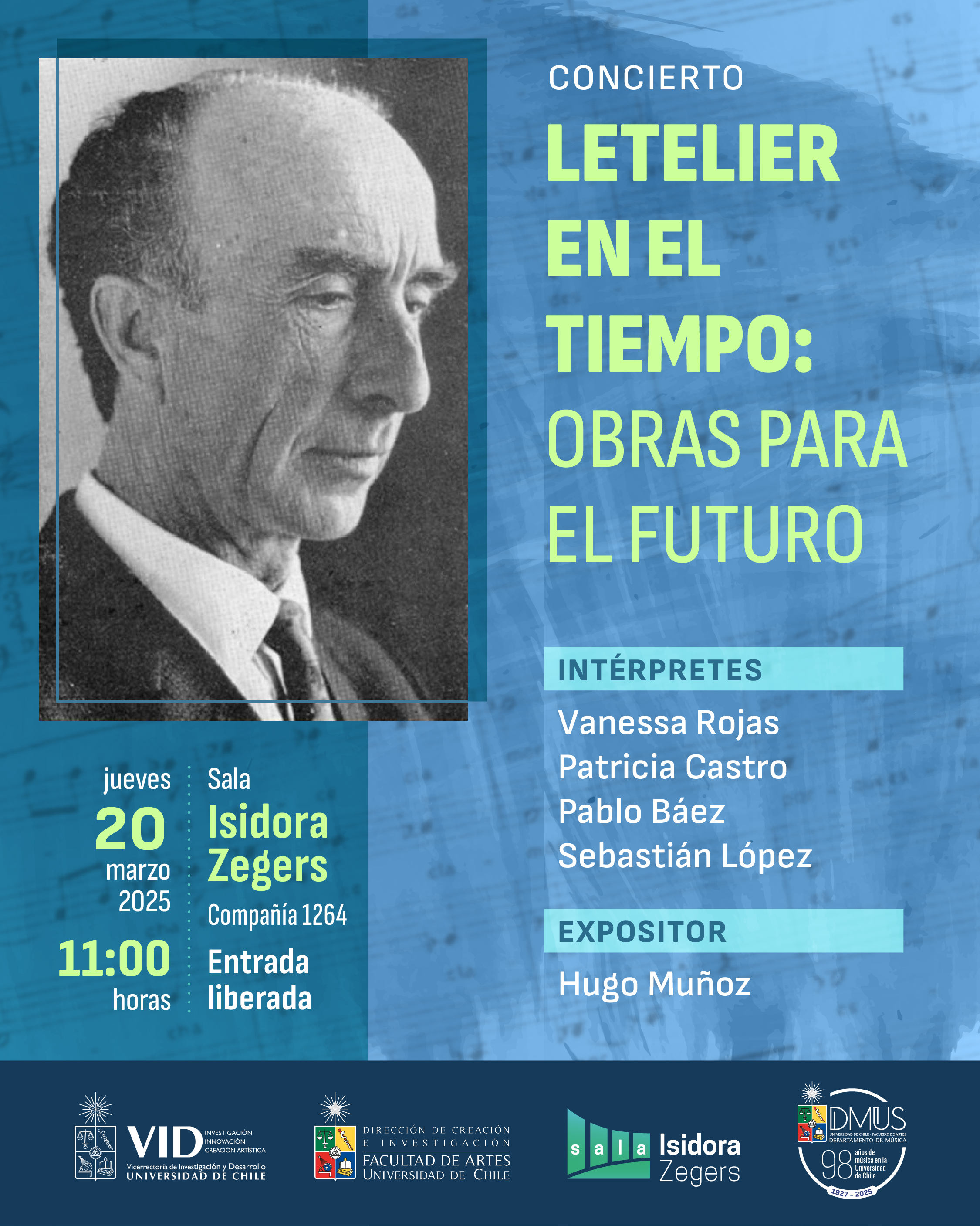 (Compañía 1264, Santiago, Santiago, Chile)"Letelier en el tiempo" es un proyecto de estudiantes y profesores del Departamento de Música liderado por la pianista Patricia Castro que busca el rescate y visibilización de las composiciones para piano del renombrado autor nacional Alfonso Letelier Llona, especialmente aquellas que han permanecido desconocidas o sin grabaciones previas.