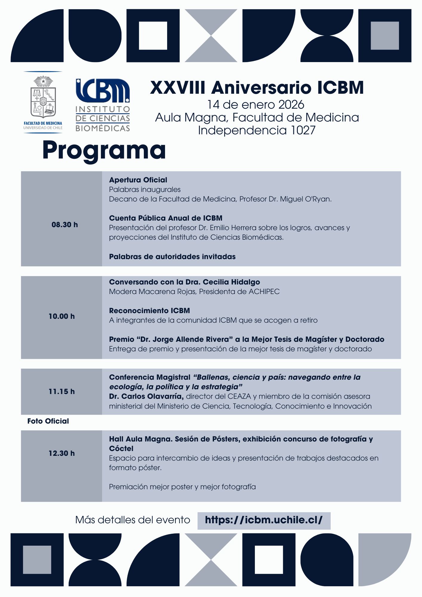 En esta oportunidad, nuestro director entregará la cuenta anual del instituto y, posteriormente, el Dr. Carlos Olavarría, director del CEAZA y miembro de la comisión asesora ministerial del Ministerio de Ciencia, Tecnología, Conocimiento e Innovación, dictará la charla magistral “Ballenas, ciencia y país: navegando entre la ecología, la política y la estrategia”. Además, se realizará una sesión de presentación de pósteres de los trabajos de investigación en curso en los laboratorios del ICBM, una exhibición del concurso de fotografía 2025 y el Premio “Dr. Jorge Allende” a la Mejor Tesis ICBM 2025.