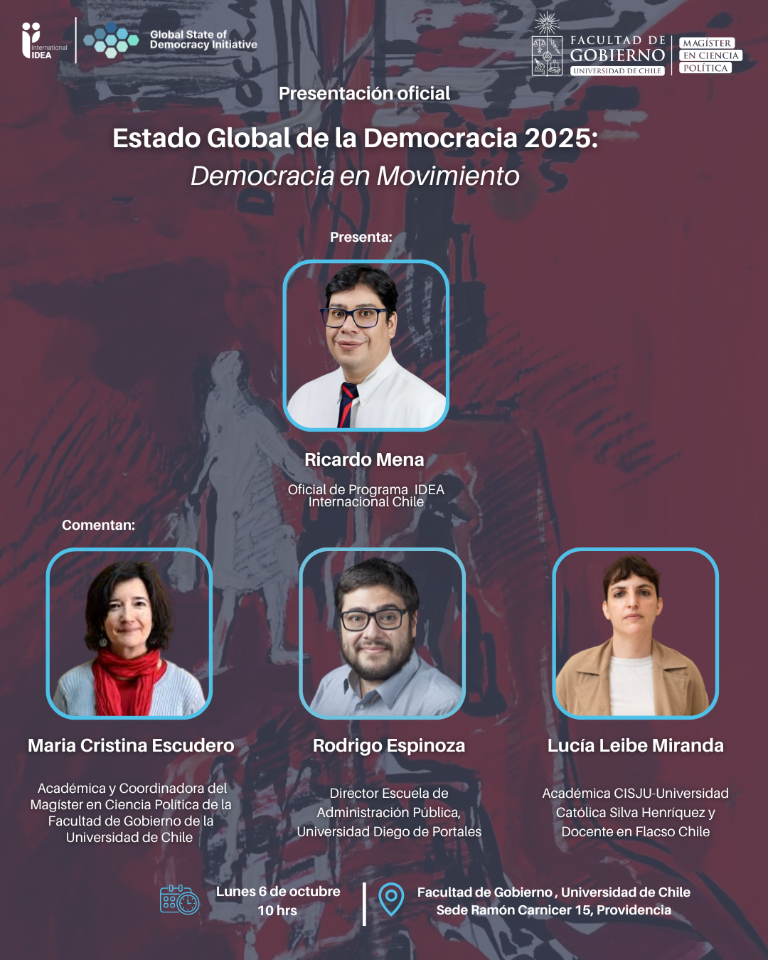 - Lugar: Ramón Carnicer 15, Providencia, Facultad de Gobierno Universidad de Chile.