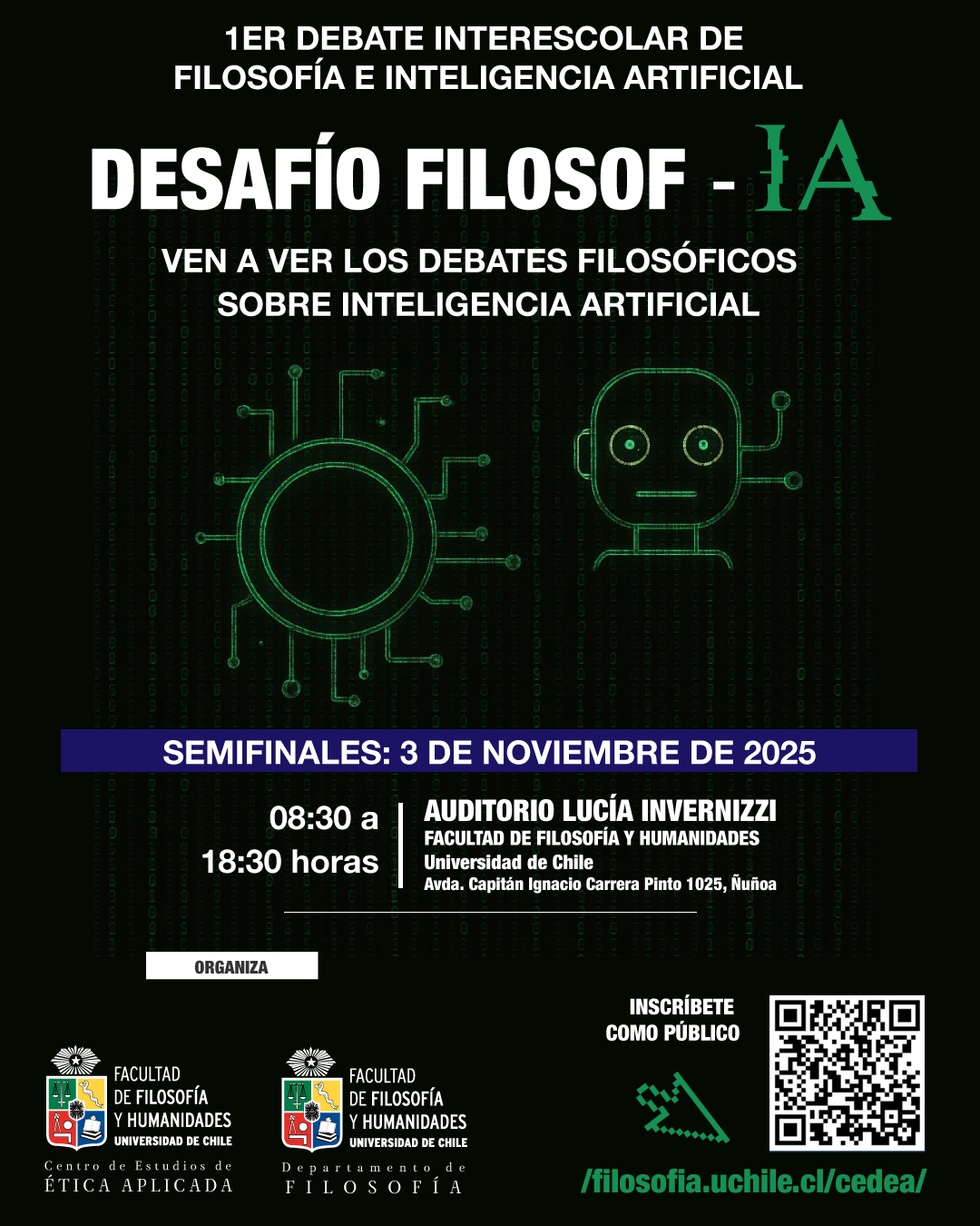 (Avda. Capitán Ignacio Carrera Pinto 1025, Ñuñoa)El Centro de Estudios de Ética Aplicada (CEDEA) de la Facultad de Filosofía y Humanidades de la Universidad de Chile, junto al Departamento de Filosofía, invitan al Desafío Filosof-IA, un campeonato interescolar de debates filosóficos en formato presencial. En esta instancia anual participan estudiantes de 3° y 4° medio junto a sus profesores y profesoras de Filosofía, quienes debatirán en torno a dilemas éticos, existenciales y políticos vinculados con la Inteligencia Artificial (IA), utilizando para ello diversas herramientas tecnológicas —como ChatGPT y otros programas de software abierto— que forman parte del mismo objeto de reflexión.
