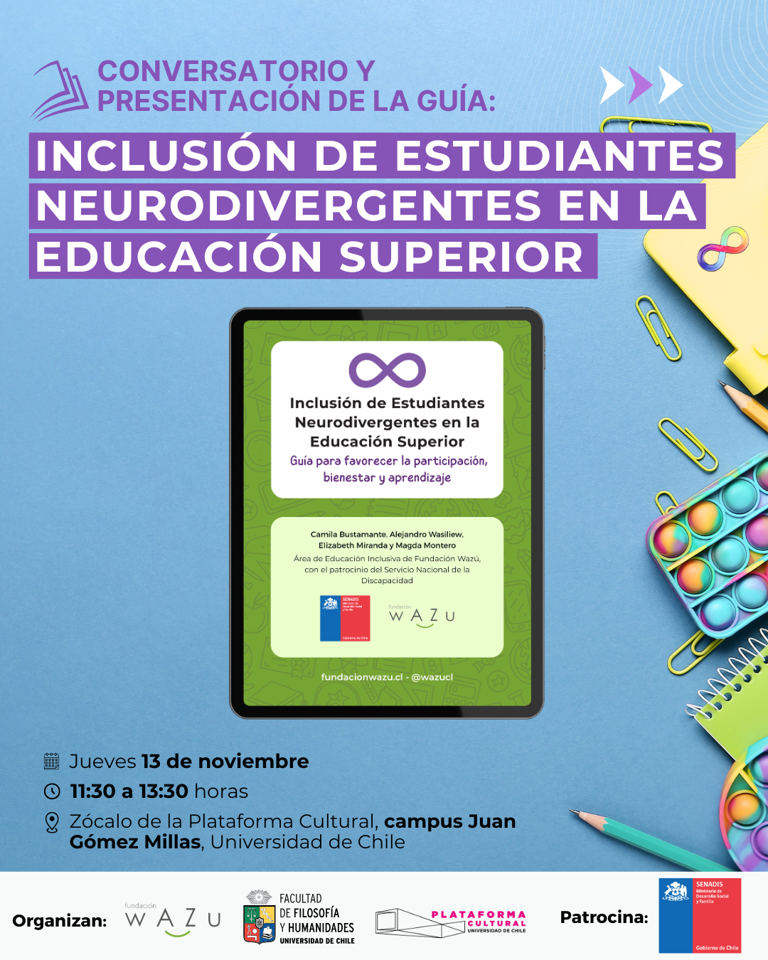 (Avenida Grecia 3401, Ñuñoa)La Fundación Wazú y la Facultad de Filosofía y Humanidades de la Universidad de Chile las y los invita al conversatorio y presentación de la guía "Inclusión de estudiantes neurodivergentes en la educación superior", escrita por Camila Bustamante, Alejandro Wasiliew, Elizabeth Miranda y Magda Montero, del Área de Educación Inclusiva de Fundación Wazú. La iniciativa busca visibilizar los desafíos que enfrentan estudiantes neurodivergentes en la educación superior y entregar a las instituciones herramientas para generar espacios donde la diversidad sea comprendida, valorada y acompañada.