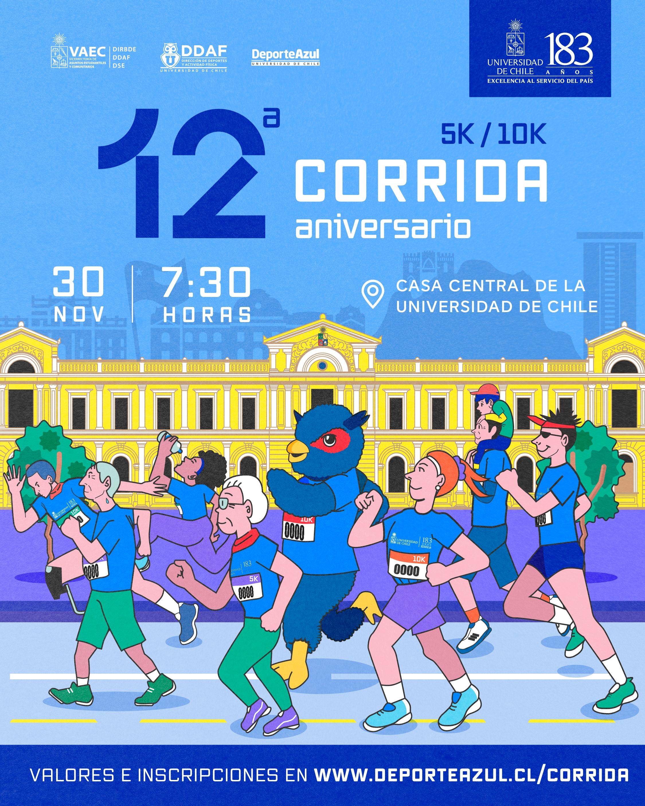 Esta tradicional corrida congrega a toda la comunidad universitaria en una jornada deportiva y recreativa que invita a estudiantes, académicos(as), funcionarios(as), junto con la comunidad Alumni U. Chile y el público general, a participar y disfrutar del deporte en un ambiente de encuentro y celebración.