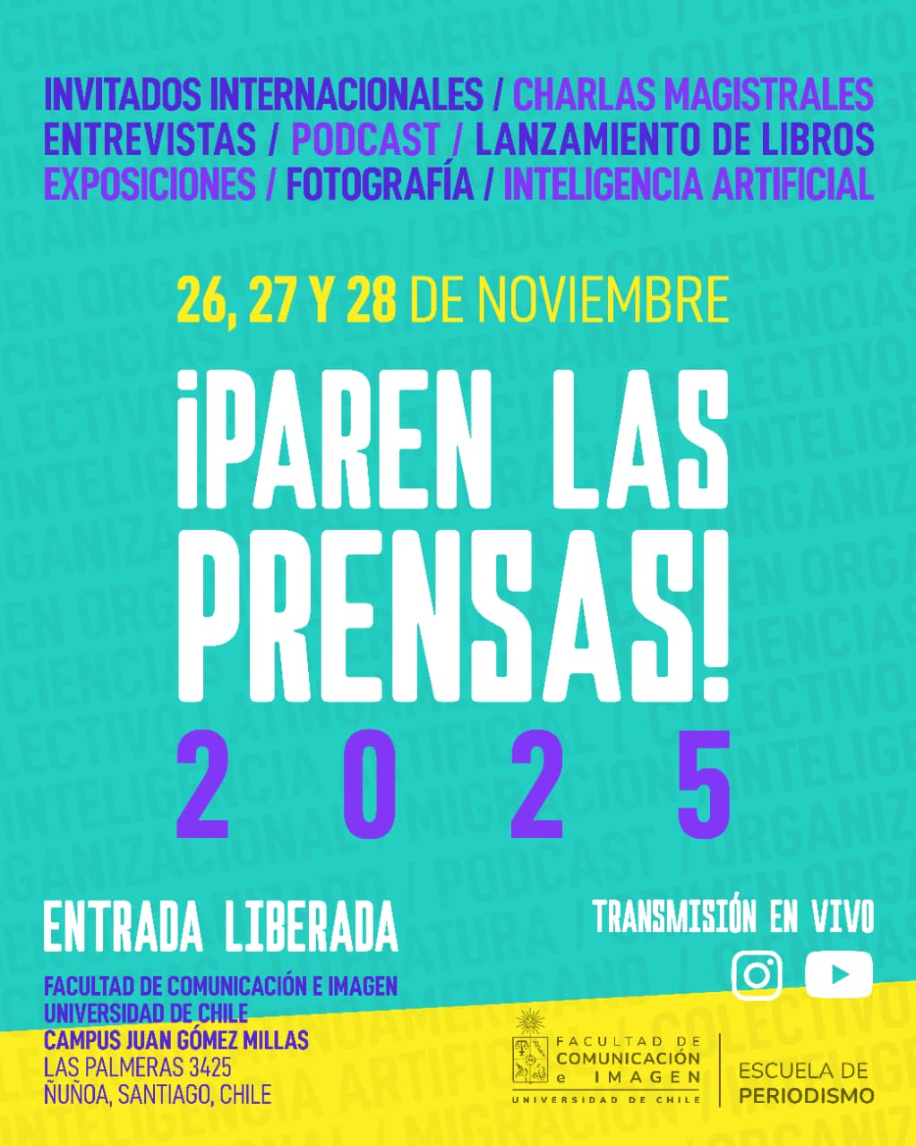 El 26, 27 y 28 de noviembre, la Facultad de Comunicación e Imagen (FCEI) de la Universidad de Chile y su Escuela de Periodismo abrirán sus puertas a la segunda edición de ¡Paren las Prensas!, jornadas periodísticas que buscan ofrecer un espacio de reflexión y análisis sobre la relación intrínseca del periodismo con la fiscalización al poder y la exploración de nuevas narrativas. Durante tres días, reconocidos periodistas nacionales e internacionales se reunirán para compartir sus experiencias y discutir temas cruciales para el ejercicio periodístico en la Facultad de Comunicación e Imagen de la Universidad de Chile.