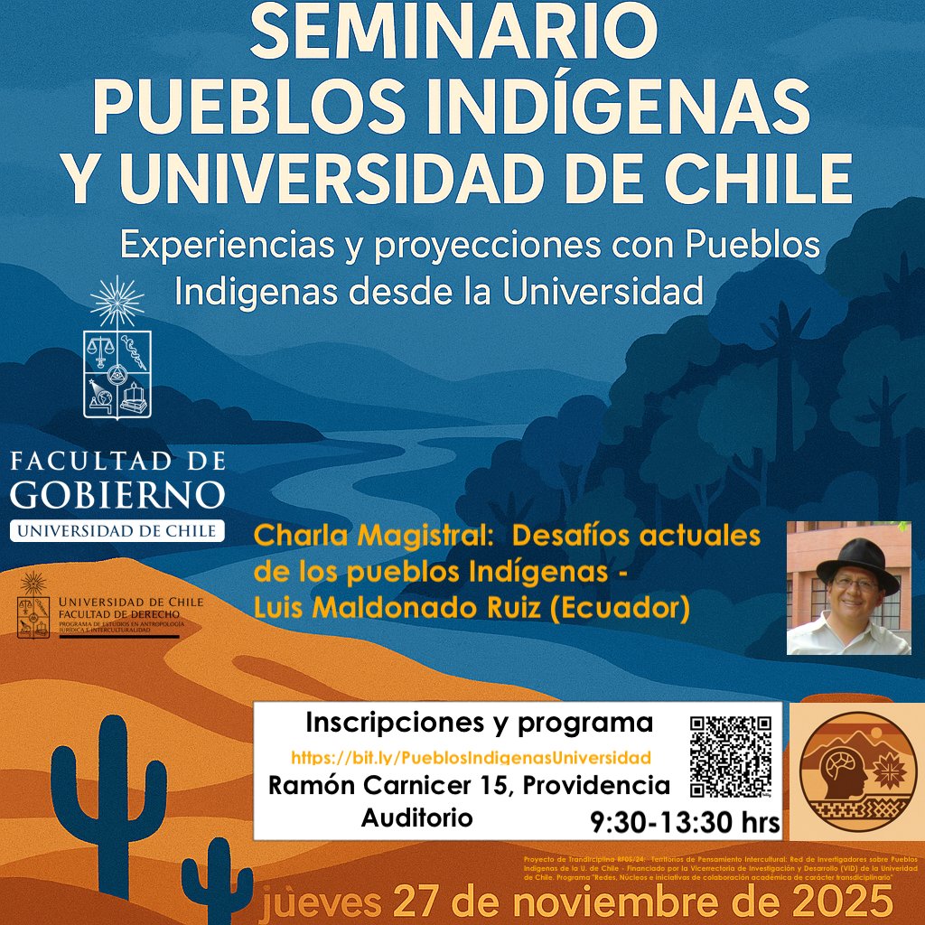 (Ramón Carnicer 15, Providencia)La Facultad de Gobierno tiene el agrado de invitar a la comunidad universitaria y al público interesado a participar en el Seminario "Pueblos Indígenas y Universidad de Chile", un espacio clave para reflexionar sobre las experiencias y los futuros desafíos de la relación entre la academia y los pueblos originarios.