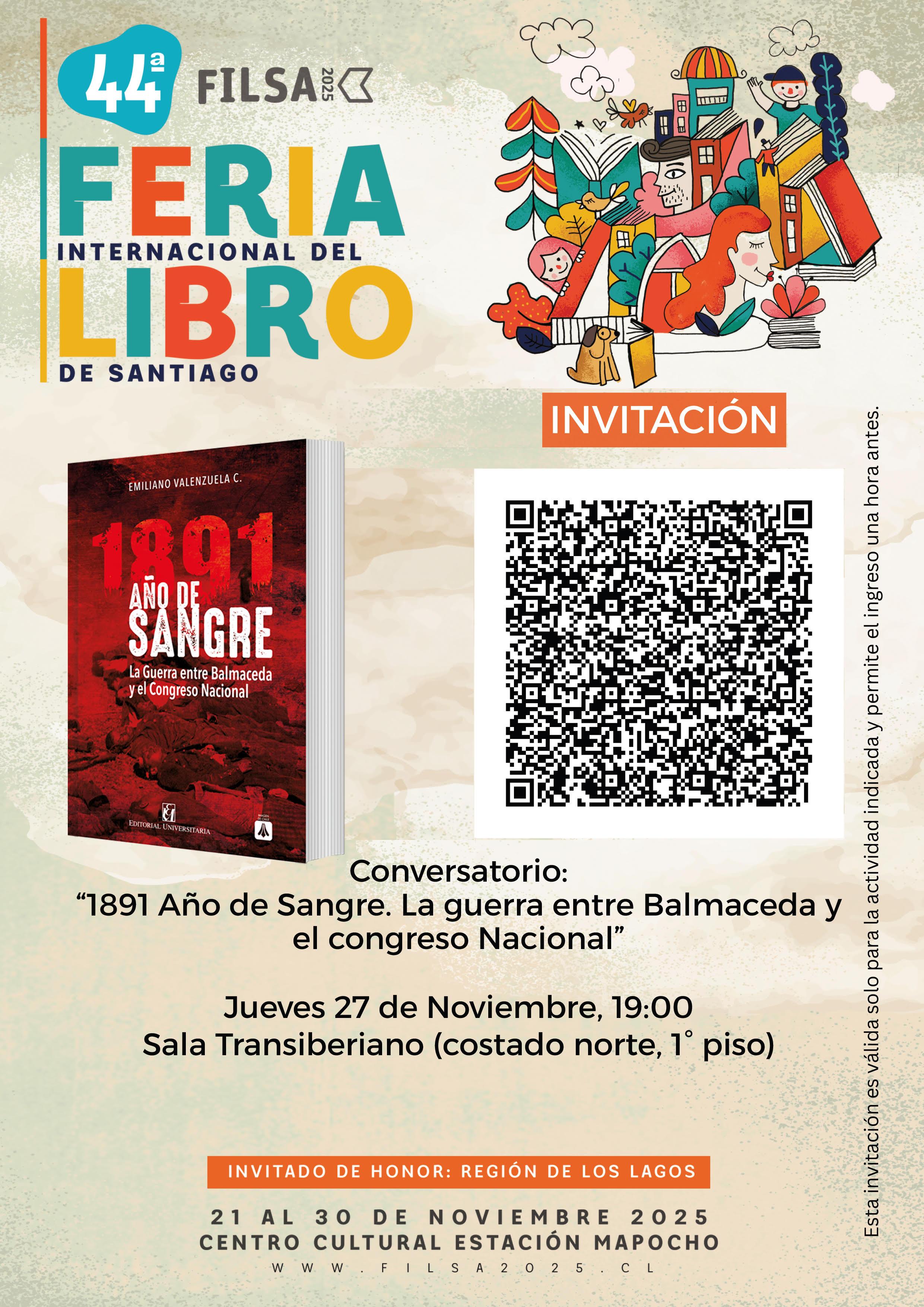 (Centro Cultural Estación Mapocho)En el marco de la 44ª Feria Internacional del Libro de Santiago (FILSA), Editorial Universitaria invita al conversatorio sobre 1891. Año de sangre, investigación del periodista y académico Emiliano Valenzuela que revisita uno de los episodios más decisivos de la historia política chilena: la Guerra Civil de 1891 y el conflicto entre el presidente José Manuel Balmaceda y el Congreso Nacional.
