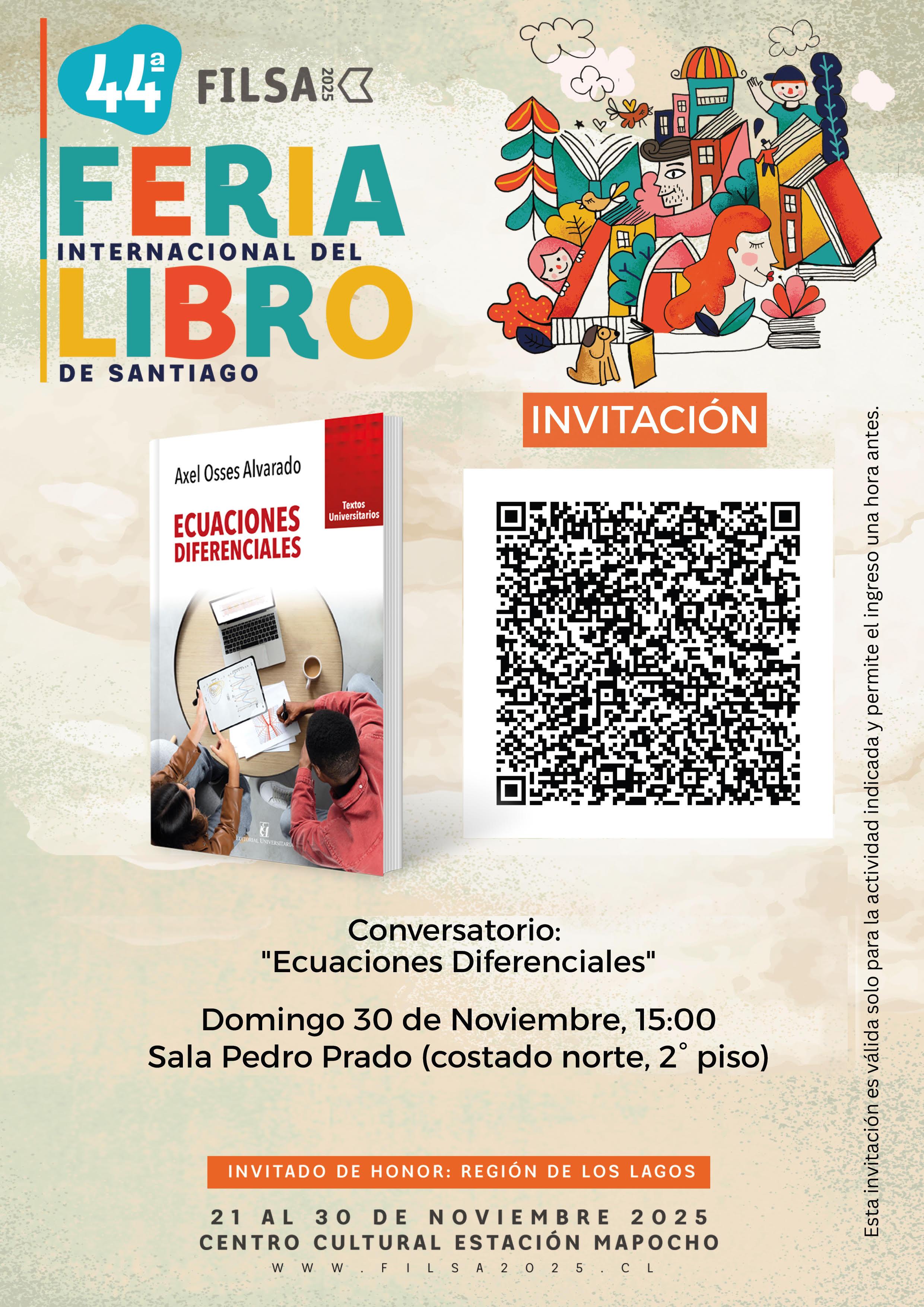(Centro Cultural Estación Mapocho)Como parte de la programación de la 44ª Feria Internacional del Libro de Santiago (FILSA), Editorial Universitaria invita al conversatorio en torno al libro Ecuaciones diferenciales, del académico Axel Osses Alvarado. La obra forma parte de la colección Textos Universitarios y ofrece una guía clara y didáctica para el estudio de modelos matemáticos fundamentales, siendo un recurso clave para estudiantes y docentes de disciplinas científicas y tecnológicas.