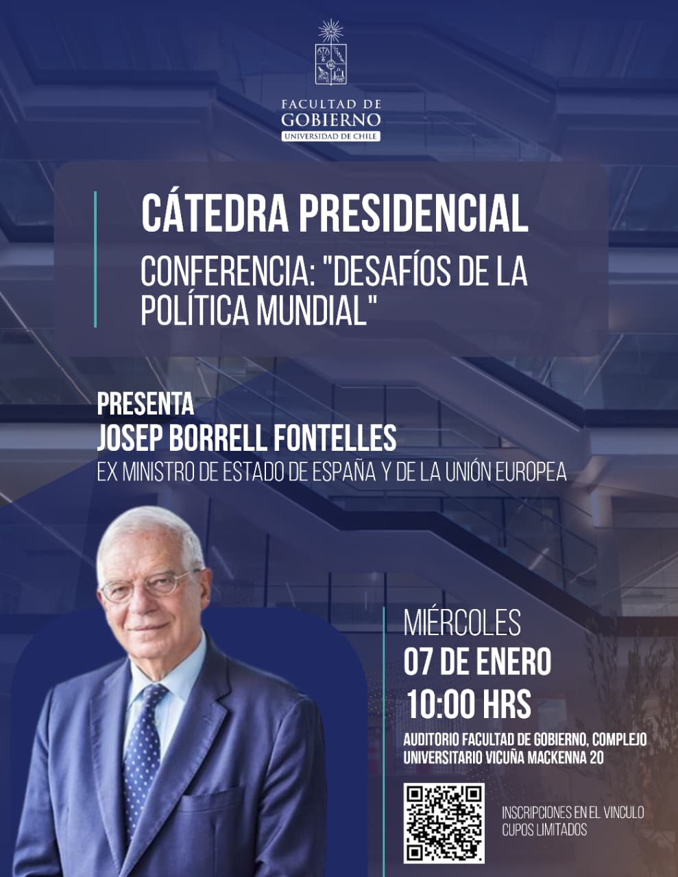 (Ramón Carnicer 15, Providencia.)La Facultad de Gobierno de la Universidad de Chile invita a toda la comunidad académica, estudiantil y al público interesado a una nueva sesión de su prestigiosa Cátedra Presidencial. En esta oportunidad, contaremos con la destacada participación del Sr. Josep Borrell Fontelles, quien dictará la conferencia titulada "Desafíos de la Política Mundial".